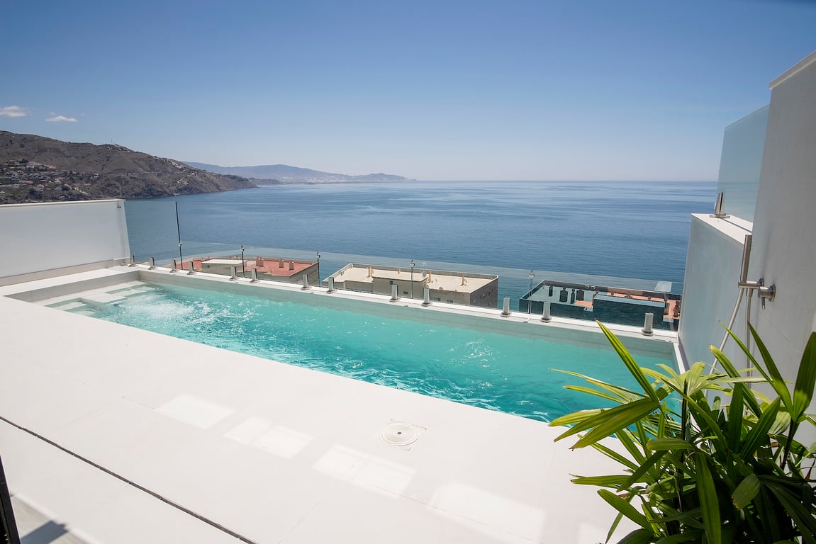 Luxury villas in almuñécar with private pool and 180 degree sea views. 15 luxury villas designed by renowned Costa del Sol architect Fernando Pérez del Pulgar. An avant-garde complex with large windows opening onto huge terraces and with 180 degree panoramic views of the Mediterranean, six villa models to satisfy all tastes and expectations. There are currently six villas left with four or five bedrooms. Located high above the sea with large windows and spacious terraces in the middle of a tro...