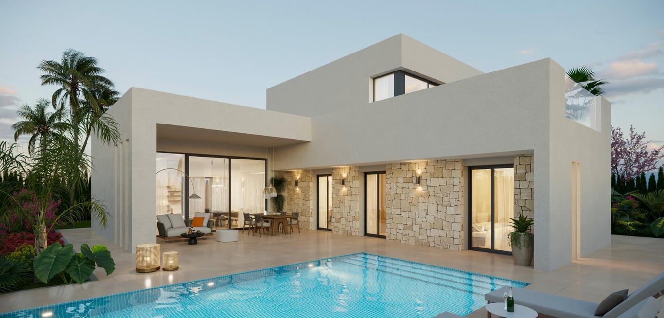 Newly built villas located in the municipality of Aspe. Newly built villas with several models to choose from, with 2, 3 or 4 bedrooms, on one or two floors and built with slabs or with a structure: depending on the model and the plot chosen, the exact price will be calculated. All the villas are built on rustic plots of over 10,000 m2, of which around 2,500 m2 will be fenced off. The villas have an open-plan kitchen with living room, built-in wardrobes, private swimming pool, porch, storage ...