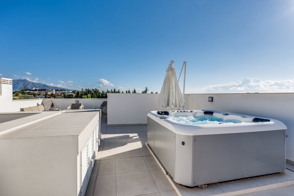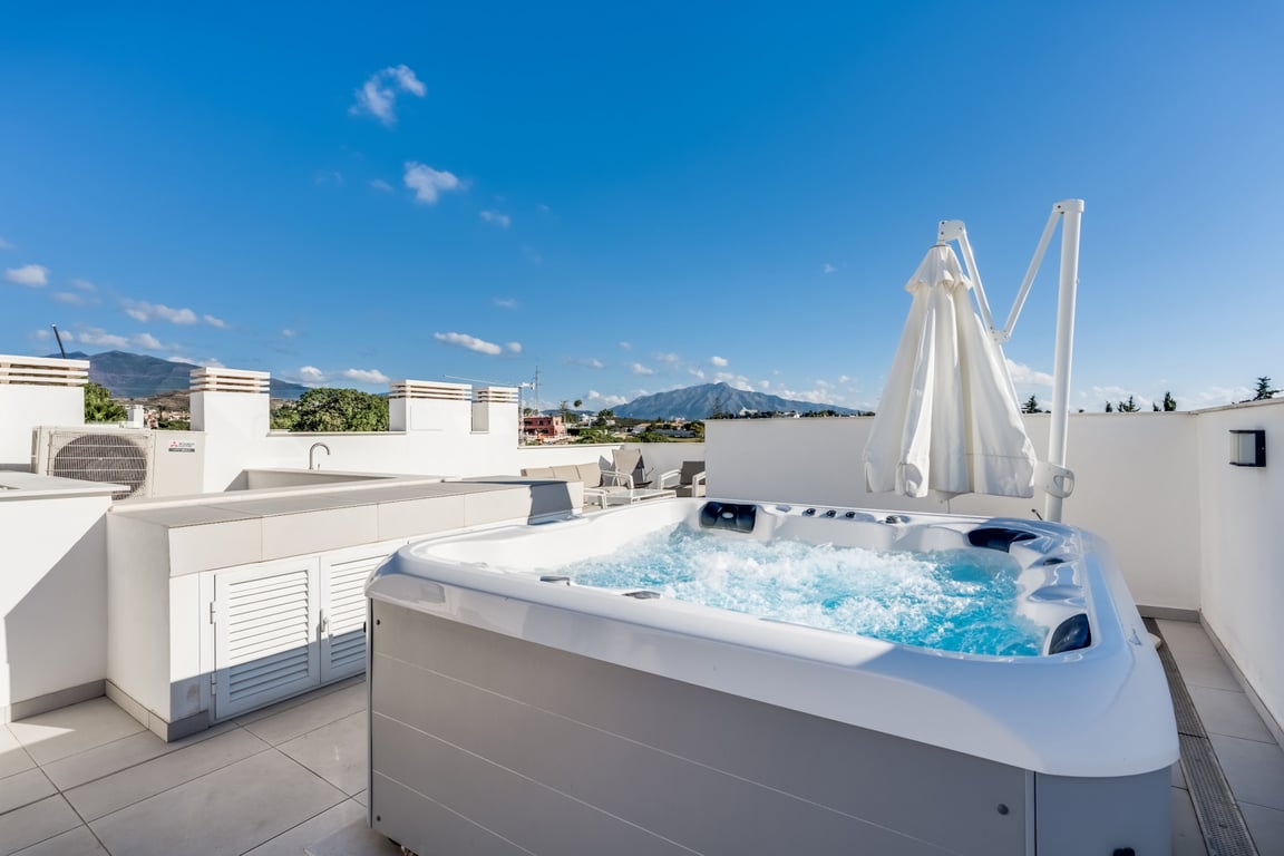 Los Miradores del Sol is a distinctive development situated on the New Golden Mile. This contemporary property features four bedrooms, three bathrooms, and an open-plan dining and living area, with direct access to the communal pool and several terraces, including a spacious rooftop terrace equipped with a BBQ area and Jacuzzi. Luxurious townhouse, where every detail radiates elegance and comfort for your enjoyment. This beautifully designed property offers a brand-new interior. Experience th...