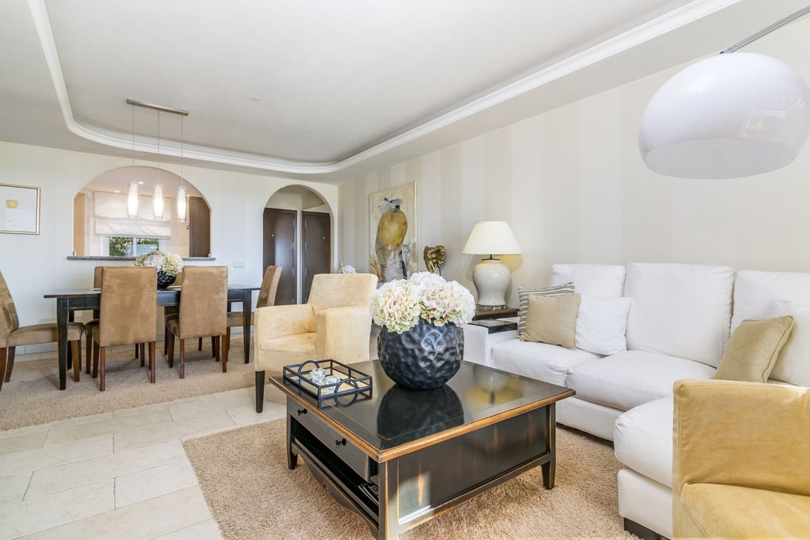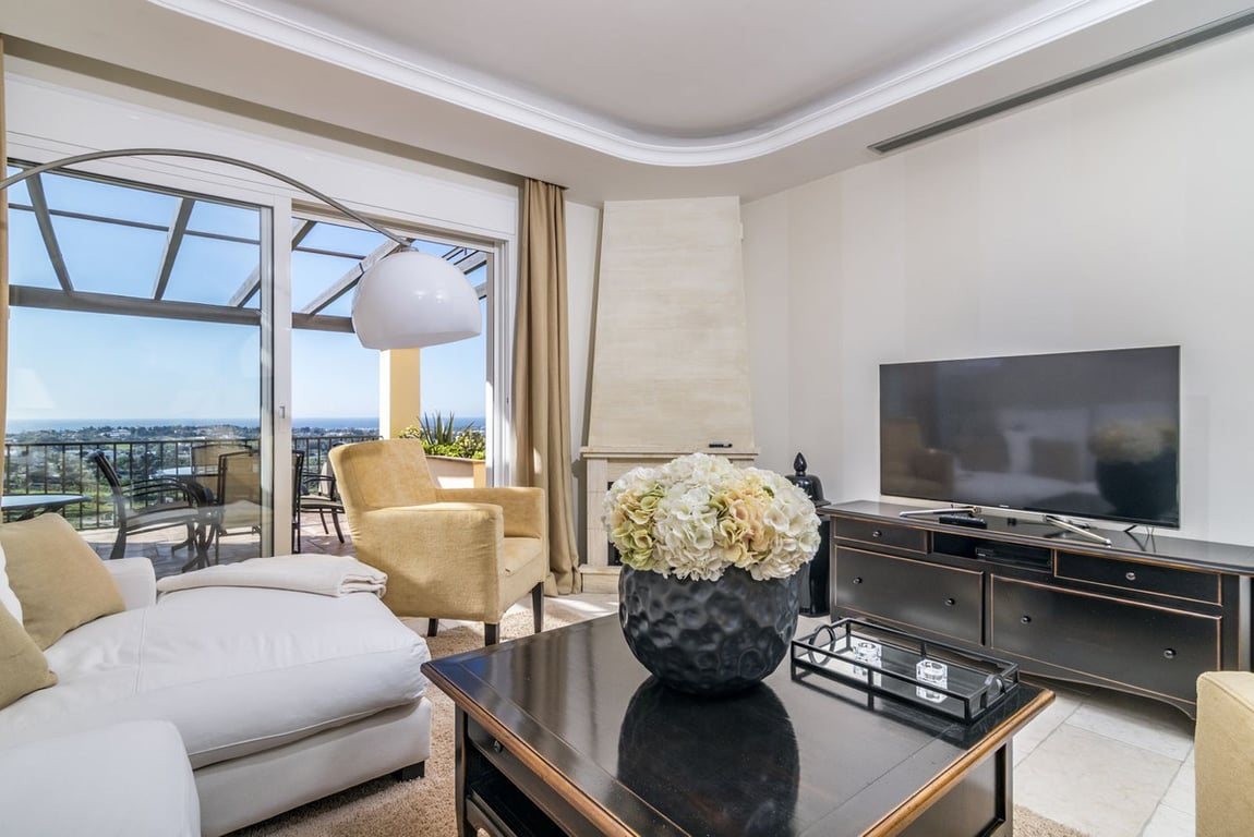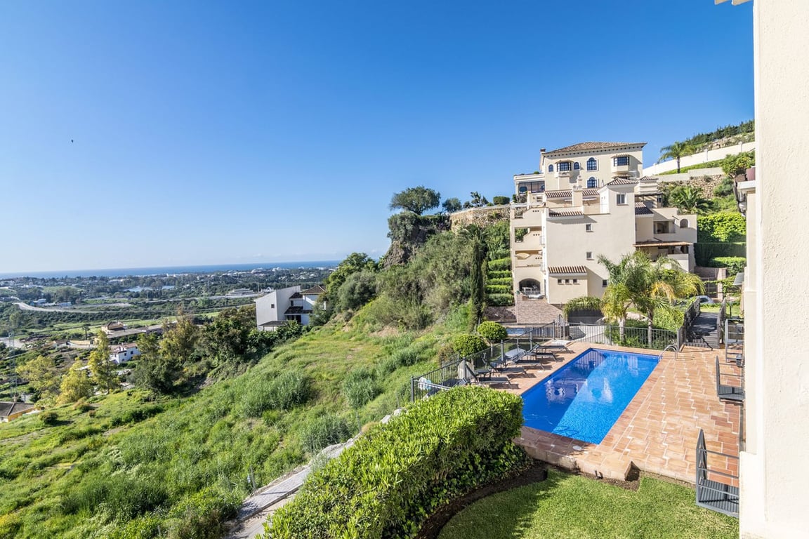 Nicely located quality duplex penthouse in Los Almendros, Benahavís.South facing with spectacular views to the Mediterranean and the coast. Main floor with living and dining area, fully fitted kitchen, second kitchen/terraced, one guest bedroom suite and a guest toilet. Direct access to the terrace. Upper floor with master bedroom suite and another guest bedroom suite. Solarium – roof terrace with BBQ area. Garage space and storage. Small community with mature gardens and community pool.
