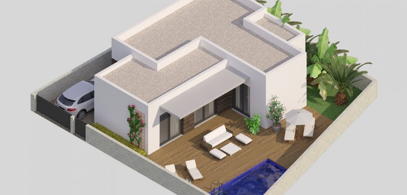 NEW BUILD MODERN VILLAS IN BENIJOFAR New Build villas located in Benijófar, a privileged area of the Costa Blanca, equipped with all services, 20 minutes from Alicante Airport, near the beautiful beaches of Guardamar and several golf courses. It is a modern style villas consisting of spacious living-dining room with an open-plan kitchen, 2 bedrooms( one of them en-suite) and 2 bathrooms. It also has a private plot with terrace, parking area, private pool, Mediterranean-style garden with gre...