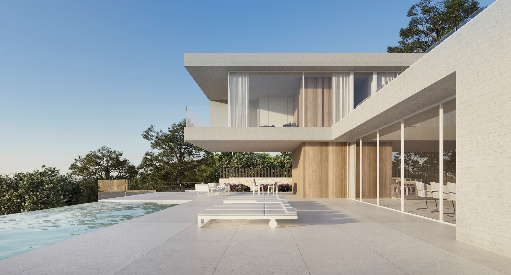 Luxury villa in Benissa with SEA VIEWS and the impressive Peñón de Ifach . This villa, with paneled exposed concrete finishes, has 4 floors that are connected with an elevator and an internal staircase. The ground floor has a large open living-dining-kitchen and a toilet. The kitchen is fully equipped and has an island for cooking. Sliding doors at ceiling height give direct access to a large terrace and pool. The upper floor contains two bedrooms with en-suite bathrooms and a terrace. The pro...