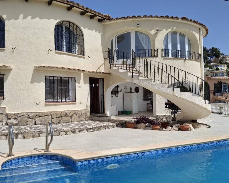 Villa for sale in Montemar South facing villa comprising of 2 apartments with views towards the sea and Calpe Rock. At the front of the property, there is driveway parking and a large garage with workshop area. From the parking area, there is flat access into the main living level. The property consists of: entrance hallway, large lounge with fireplace with log burner and hot and cold air-conditioning, a spacious dining room with views to the sea, a fully fitted kitchen, shower room and a doubl...