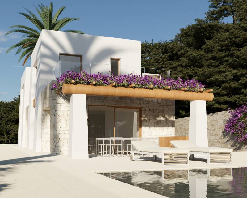 New build villa for sale in Montemar This south facing, Ibizan style villa has lovely panoramic views to the sea and will be built on 3 floors. On the basement floor is the outdoor parking area for 2 cars, garage for 1 car and a storage room. Stairs or lift to the ground floor with lounge-diner with open kitchen and access to the terraces and the pool, bedroom with ensuite bathroom and guest cloakroom. On the upper floor are 2 bedrooms with ensuite bathrooms and 2 additional terraces. The house...