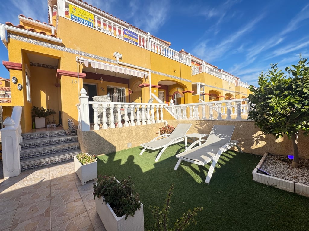 This charming semi-detached 2-bedroom, 2-bathroom house is powered by solar energy, perfect for sustainable living. Enjoy the spacious L-shaped garden with front and rear terraces, ideal for alfresco dining and relaxation. Key Features: - 2 bedrooms with a modern bathroom - Solar power for eco-friendly living - Large L-shaped garden with terraces - Located on the outskirts of a gated community with access to 2 communal pools - Prime spot between La Zenia and Cabo Roig - convenience and t...