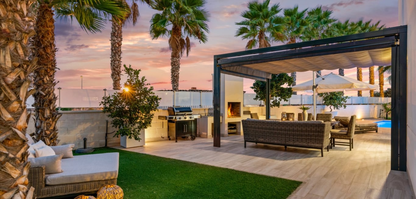 The villa is centrally located with a 10-minute walk to Spain's largest outdoor shopping centre, restaurants and grocery stores. 20 minute walk to the beach. The nearest restaurants are a few meters away. The house has a large outdoor area on the ground floor with sunbeds, sofa groups, dining area and lounge. Perfect property for people who want that little something extra. There is an outdoor kitchen with a sink, grill and space for a large dining table, which is often a meeting point for la...