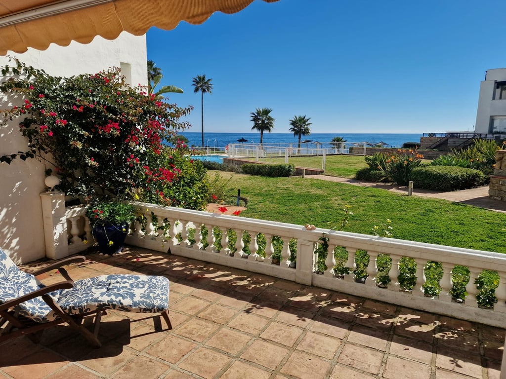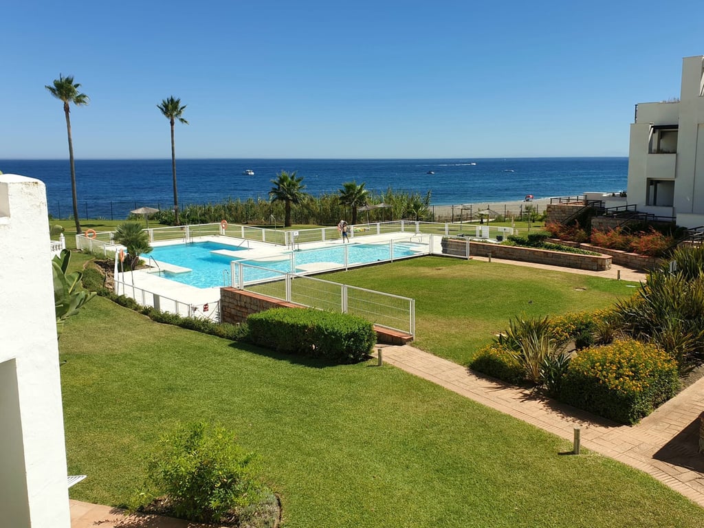 Located within the exclusive beachfront community of Casares del Mar, this south-facing house represents a rare opportunity as the only house currently available for sale within the urbanisation, offering uninterrupted sea views in a gated and beautifully maintained setting. The property features a bright living-dining area opening onto a 32 m2 private ground-floor terrace with sea views, ideal for outdoor living. It offers two bedrooms and two bathrooms, including a main bedroom with access to ...