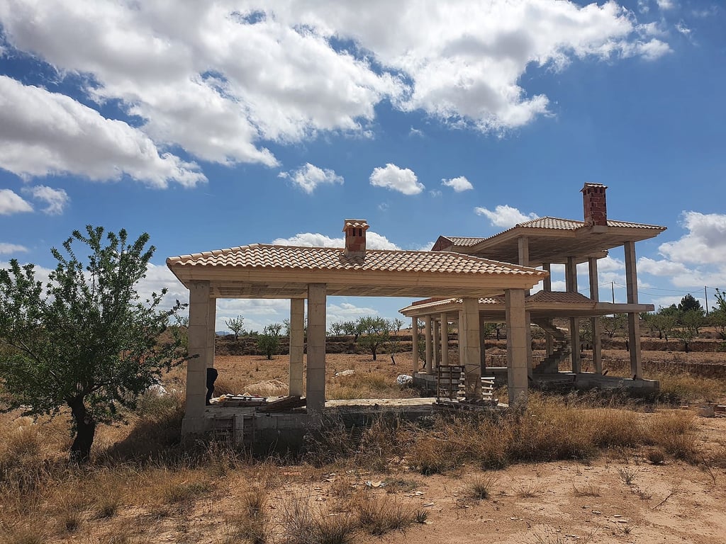 Unfinished new build in Pinoso, the owner have run out of funding for the project, the land has mains water and electric, 10,000 m2 Its for sale in the current build with skelton and roof with all permissions in place ( photo number 2 shows how you are buying it) The finished photos are so you can see what you can finish it like The house is 180 m2 with 3 or 4 bedrooms and 3 bathrooms, also you have a one bedroom annex-guest house of 32m2 with bedroom , bath room and small living room-kitche...