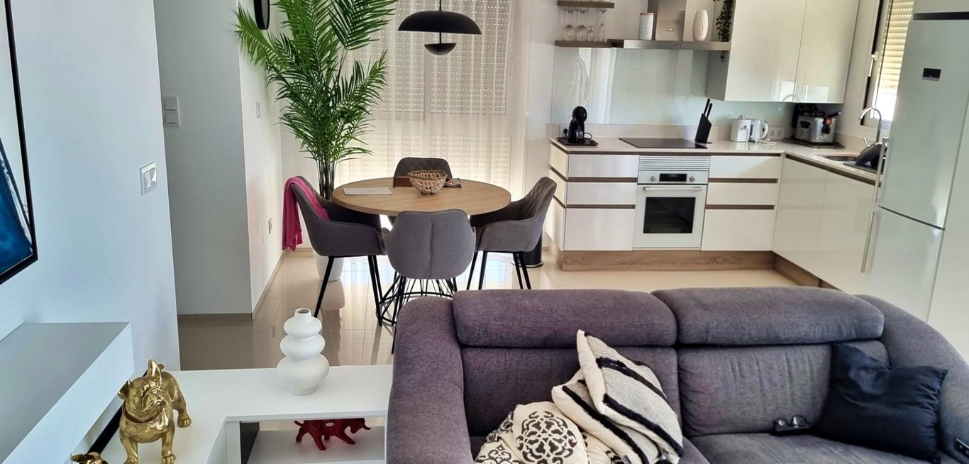 Ciudad Quesada, Doña Pepa, luxury top floor bungalow with 2 bedrooms and 2 bathrooms, 80 m2, with solarium (73m2) with views to the salt lakes, open plan kitchen, living room with fireplace, jacuzzi, summer kitchen, air conditioning, storage room, terrace, sold equipped and furnished.