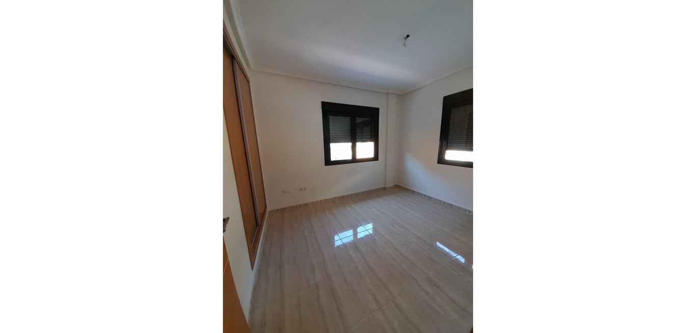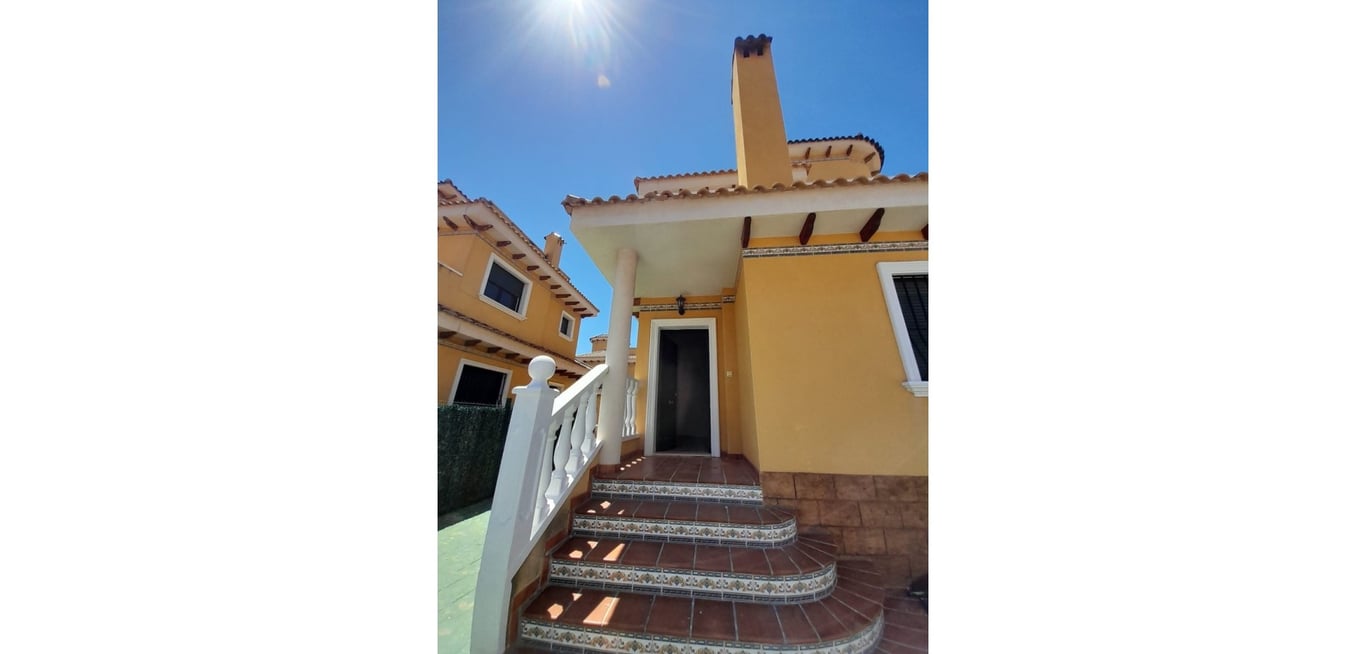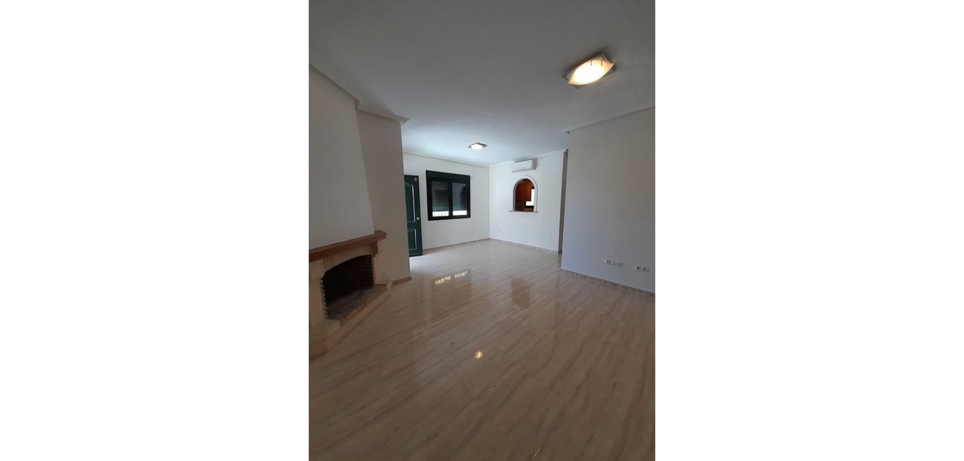 Unfurnished detached chalet with 3 bedrooms and a spacious basement (kitchen available in another property for an additional €10,000). Equipped with 2 air conditioning units (one in the living room, one in a bedroom), an enclosed gallery with sliding window, solarium, and access to a community pool. Located in a popular area of Ciudad Quesada, within walking distance of all services. Sold as is.