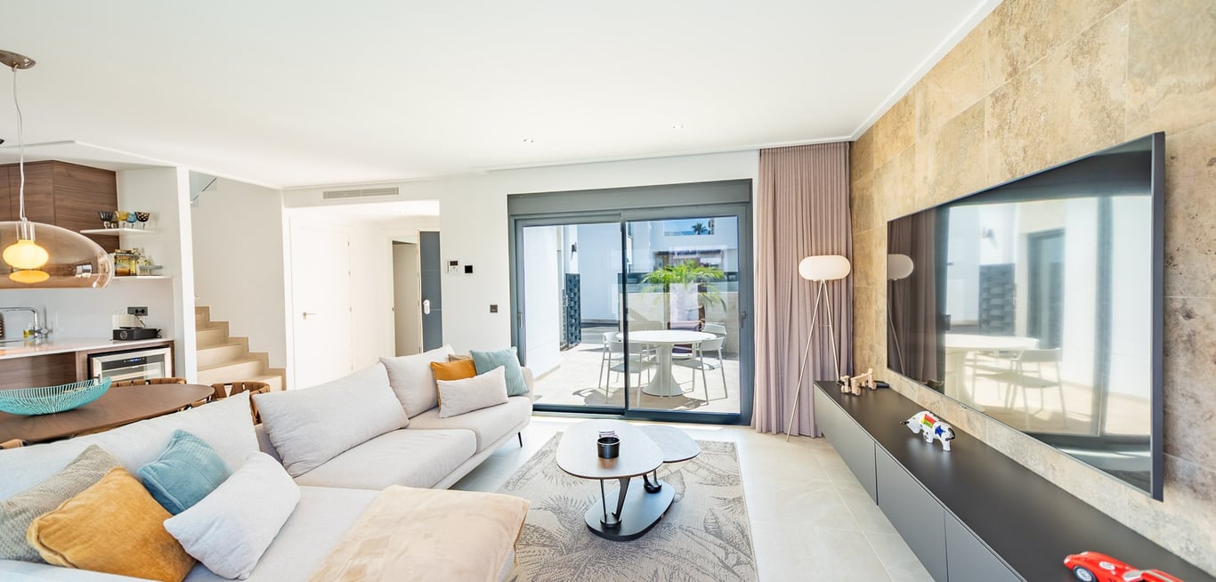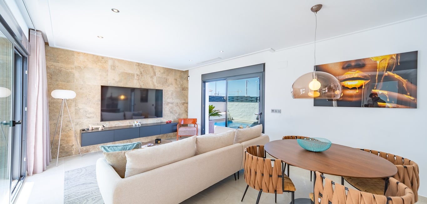 Modern Villa with Private Pool in Ciudad Quesada. Modern villa distributed over two floors, located in a private and quiet residential area in Ciudad Quesada. The property offers 3 bedrooms, 2 full bathrooms and 1 guest toilet. The ground floor features a spacious living-dining room with an open-plan kitchen, a guest toilet, and the master bedroom with an en-suite bathroom. The upper floor includes two additional bedrooms, a full bathroom, and access to a sunny terrace. The villa includes ...