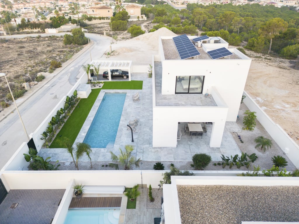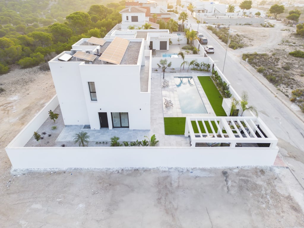Welcome to the oasis of serenity and elegance that redefines life on the Mediterranean coast. This two-storey villa, with a superior design, stands majestically in the prestigious La Marina Urbanisation, in San Fulgencio, Alicante. Entering this captivating residence is to discover a world of refinement and comfort. With an impeccable layout, it has five bedrooms, four bathrooms, where luxury is found in every detail, two of them en suite. The heart of the house, a bright living-dining room, i...