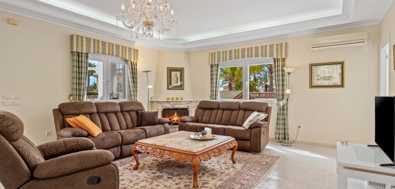 Large luxury villa with 4 bedrooms in Ciudad Quesada. The villa is set over 3 levels and has a total of four bedrooms and six bathrooms. On the main floor you can find one bedroom, one bathroom, a large living and dining room, a kitchen with additional dining space and a glazed terrace working as an additional living area. There is a lovely fireplace in the living room. From the kitchen and the glazed terrace you have direct access to the garden. On the first floor you can find two bedrooms a...