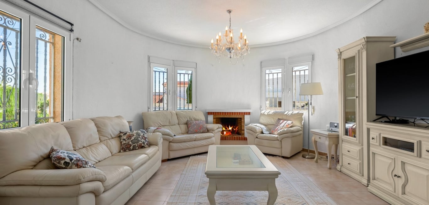 Charming 2 bedroom | 2 bathroom villa with private pool in Ciudad Quesada. The villa is set over one level and has a living area of 100 m2. It consists of two double bedrooms with fitted wardrobe, a bathroom with bathtub, an open plan kitchen and living room, and a glazed terrace that works as a dining room. The house is equipped with air condition (hot/cold), fireplace in the living room and double glazed windows. The house also has a garage with a bathroom. It is accessed by an aut...