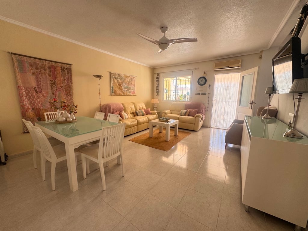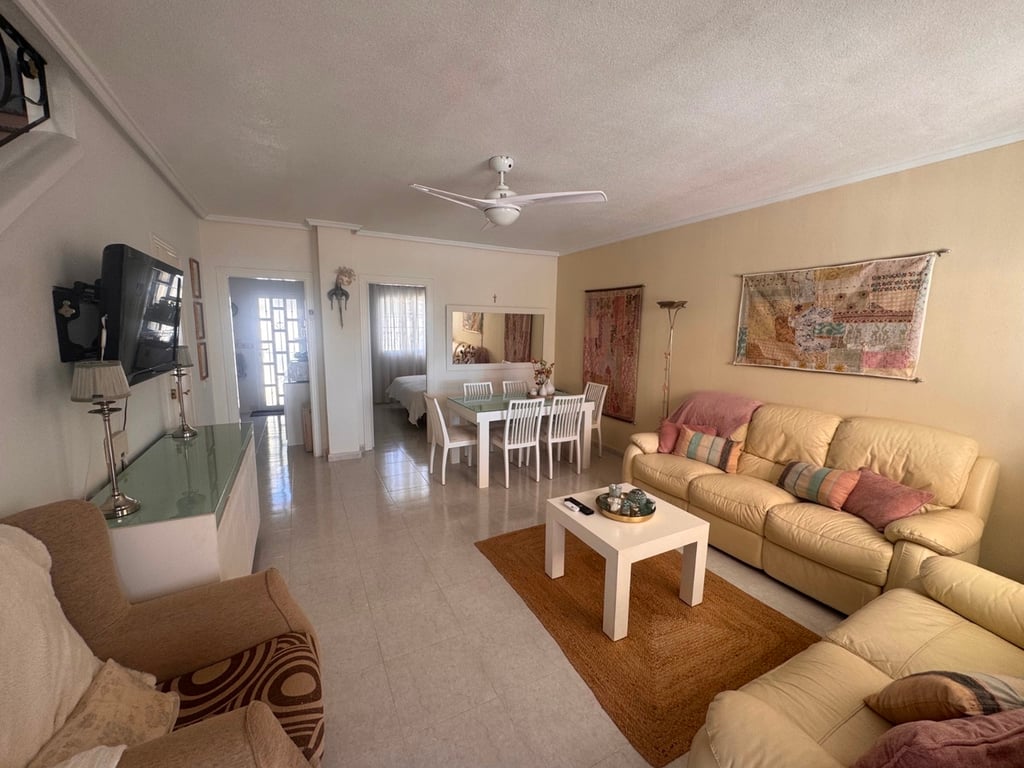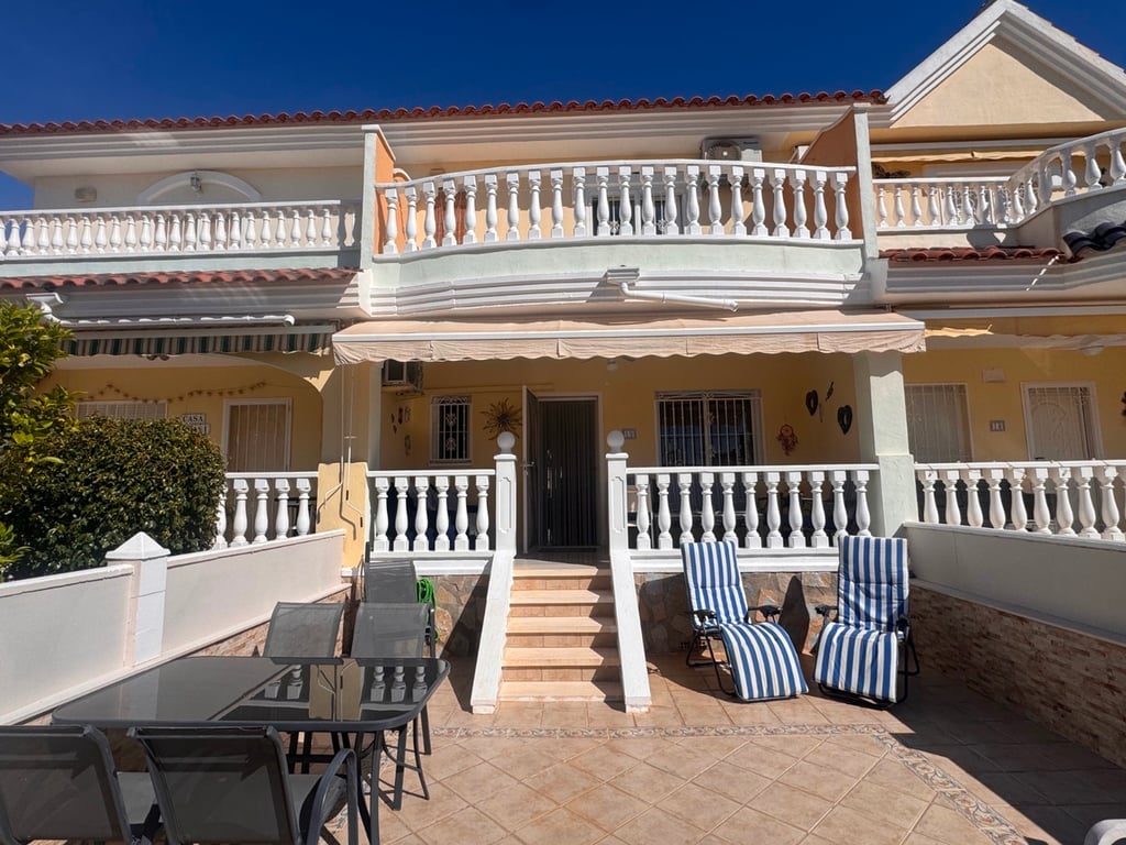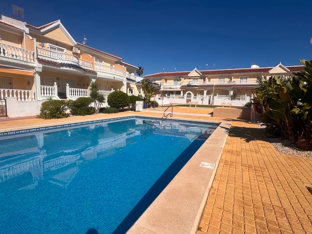 This south-facing townhouse benefits from the added advantage of direct access to the communal swimming pool, making it ideal for both permanent residence and holiday use. It also boasts a back garden on the street side, complete with a storage room housing the boiler and washing machine.The ground floor offers a bright and practical layout, including one bedroom, a fully renovated fitted kitchen, and a shower room/bathroom—perfect for guests or convenient single-level living.Upstairs, there are...