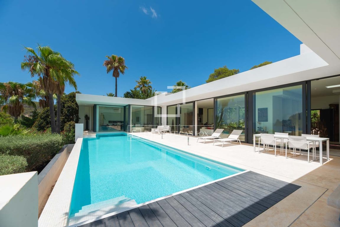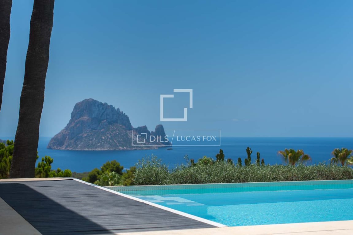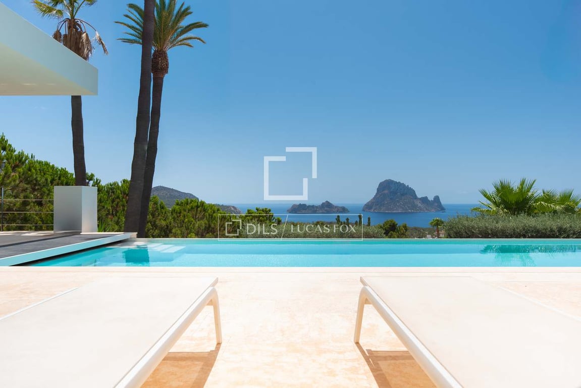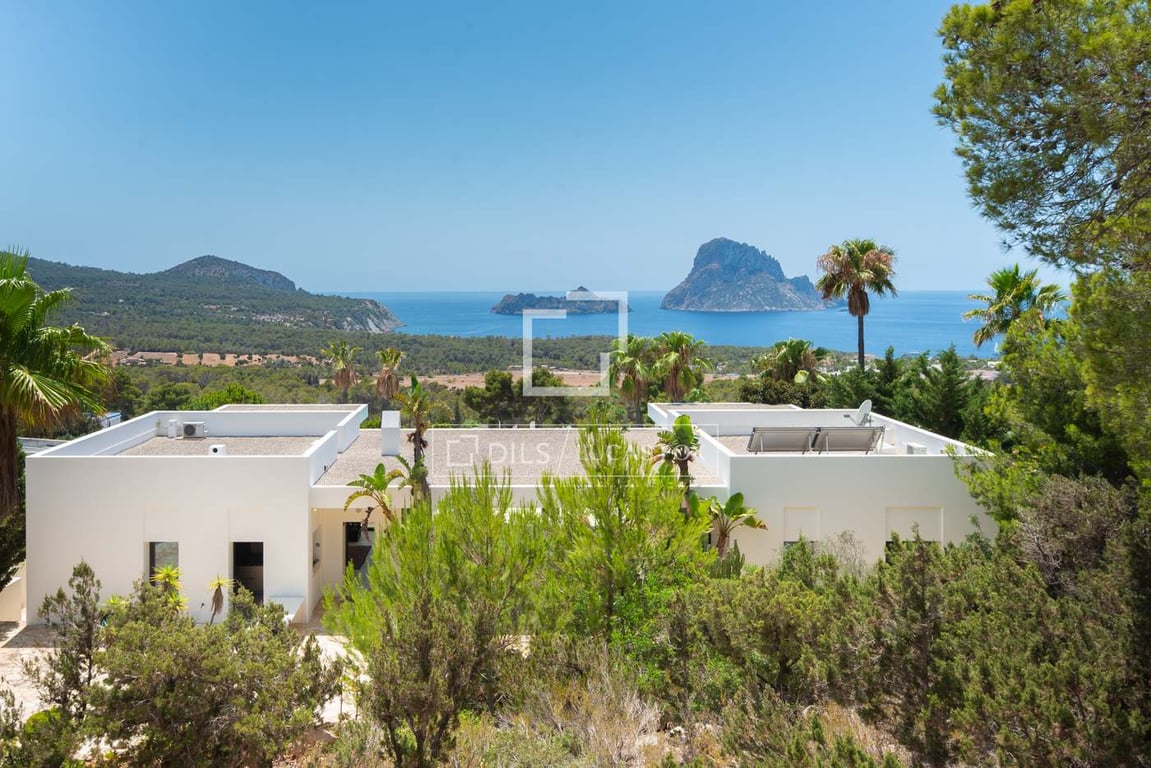 This exceptional modern villa is located on Ibiza’s west coast in the tranquil area of Cala Carbo, offering magnificent panoramic sea views and unforgettable sunsets over the iconic island of Es Vedra. Just a 3-minute drive from the charming Cala Carbo beach and 10 minutes from the lively village of San Jose, the property enjoys a peaceful setting surrounded by Ibiza’s authentic natural landscape. Tucked into a verdant hillside, it offers both privacy and proximity to key amenities. Access t...