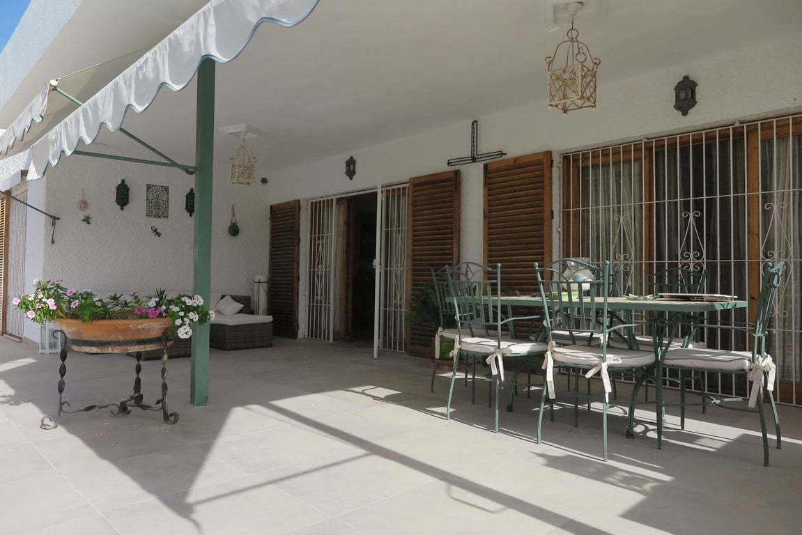 Refurbished single storey attached villa beautifully situated just 300 metres from the sea. Includes three double bedrooms, two bathrooms, well-equipped kitchen and a good-sized living area leading out to a large covered terrace. The well-kept garden has a driveway in front and at the rear there is a private patio. This lovely property would make an excellent home and/or rental investment.[IW]