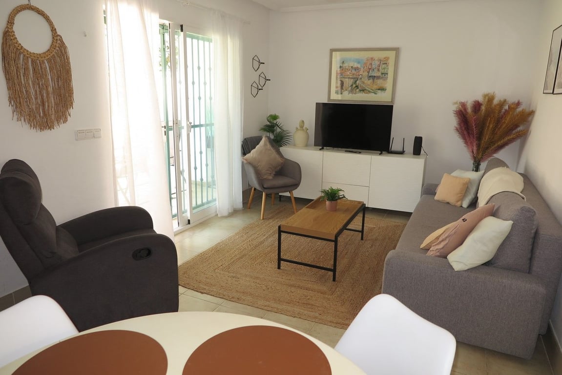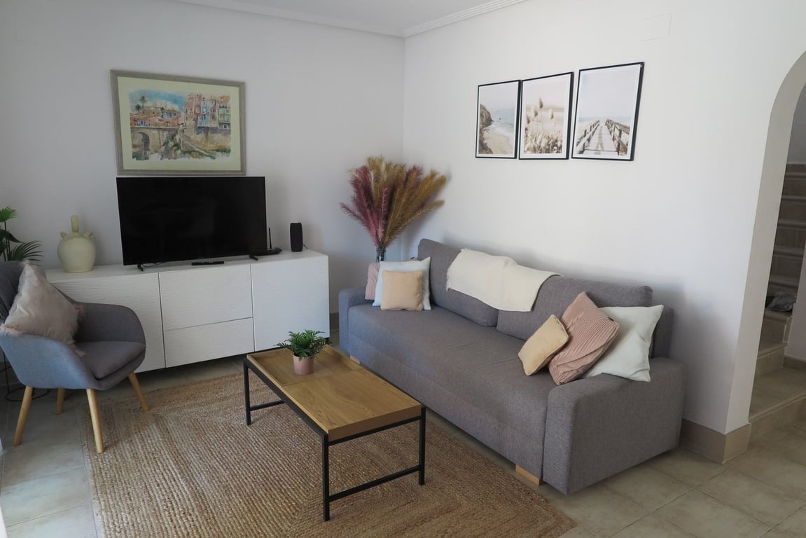 Beautiful townhouse very well located next to the sandy beach of Cala Merced with sea views. It has two double bedrooms, one with a balcony with views to the sea, a modern bathroom upstairs and a toilet downstairs, open-plan kitchen, two storage rooms, and a good-sized living room leading out to the private and sunny patio at the front. The exclusive Calanuza community enjoys an attractive pool area and has direct private access to the Venta Lanuza TRAM stop. There is secure vehicle parking with...
