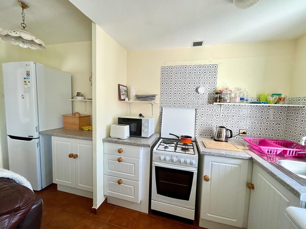 2 Bedroom upstairs bungalow with fantastic communal pool next to the Natural park for sale in El Chaparral close to Torrevieja & La Mata This lovely property is located within the private gated complex including a well maintained communal area with plants and patio areas. A staircase leads up to the open porch and side terrace with seating area ideal for al fresco dining. There is an open plan lounge diner with easy access to the kitchen situated to the rear, there are 2 large double bedro...
