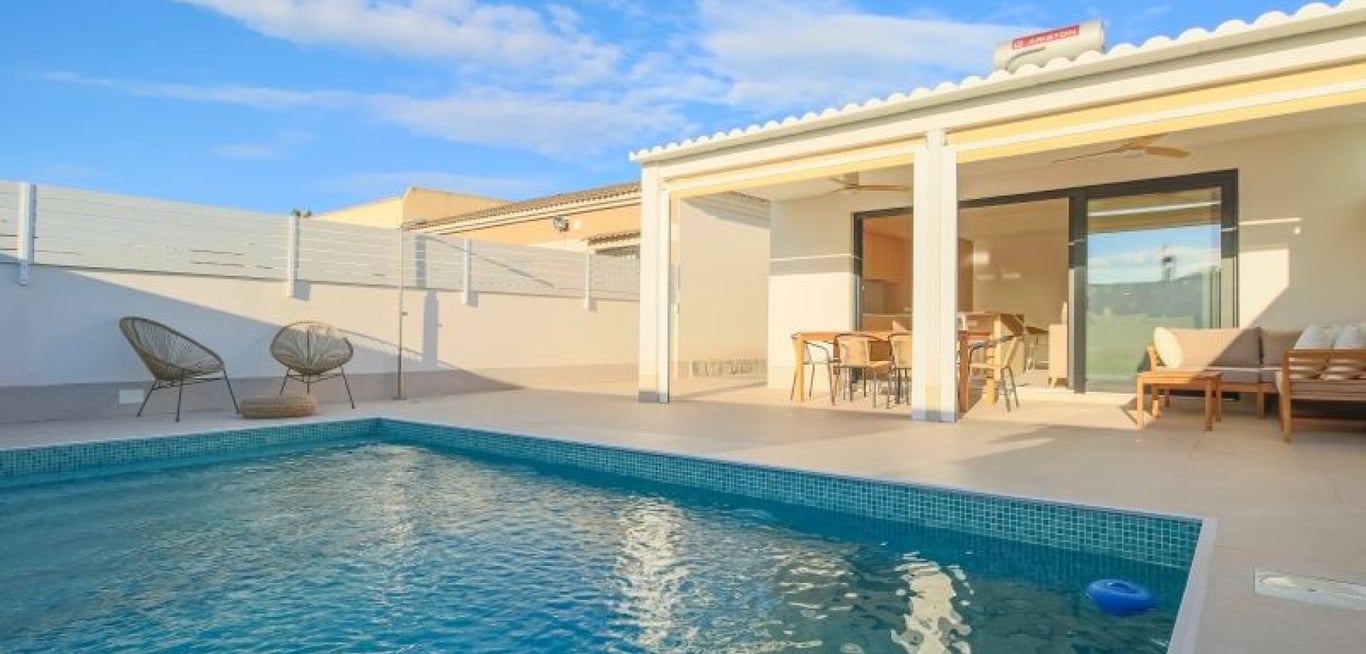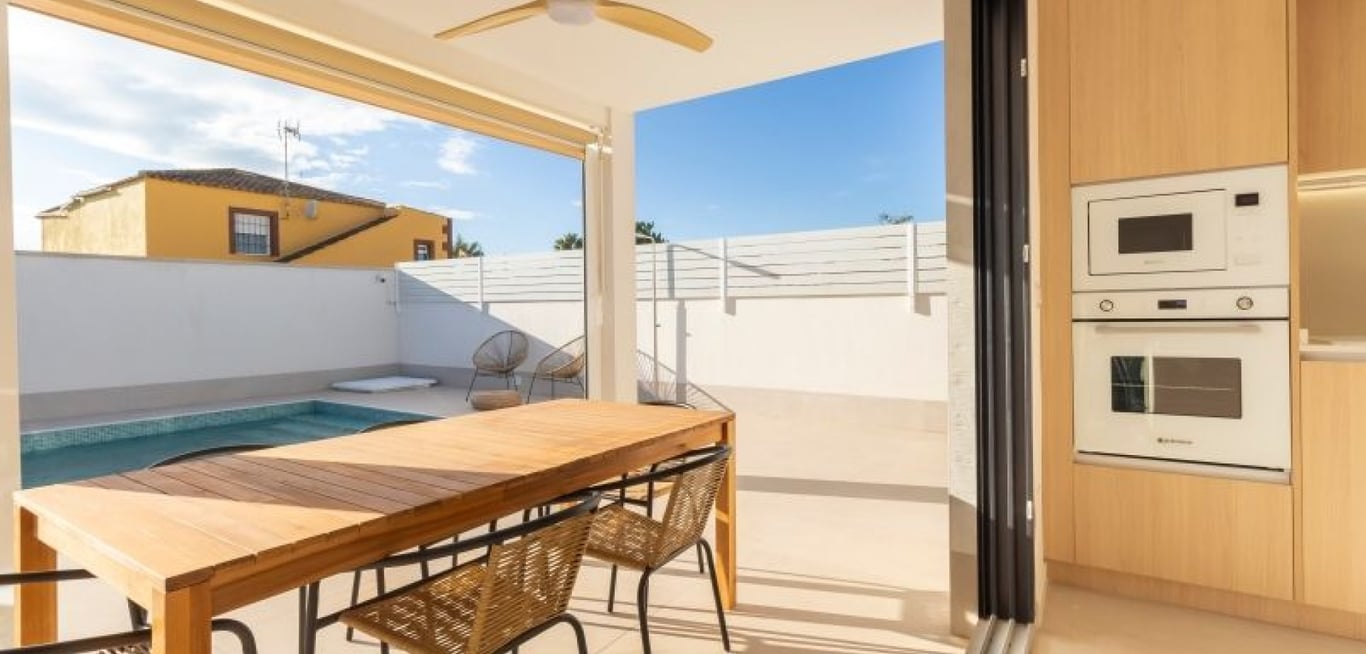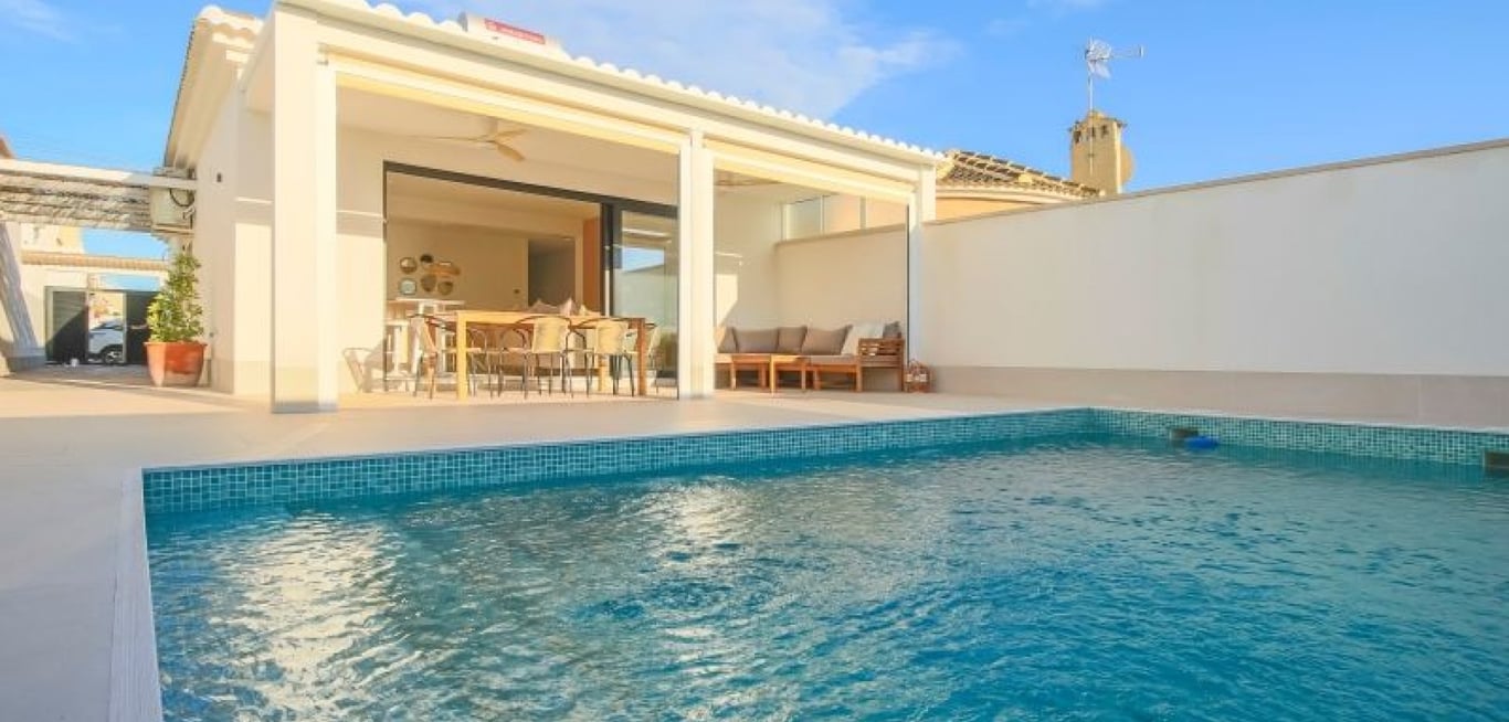Incredibly beautiful and completely renovated semi-detached house with a villa-like feel in the popular area of El Chaparral, just north of Torrevieja. The house is on one level and consists of three bedrooms, two bathrooms, and a spacious living room with an open kitchen and plenty of light. From the living room, you can access the grounds with the beautiful patios and the inviting pool area. The house was completely renovated in 2024 and has a bright, modern, and very elegant design. The ent...
