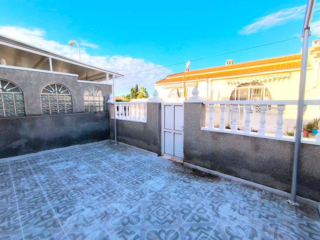 Two bedroom terrace bungalow in the popular El Chapparal/San Luis area on the outskirts of Torrevieja. Completely renovated and freshly painted, ready to move in. It features an open-plan living-dining room and kitchen, two bedrooms, and a full bathroom. The kitchen boasts brand-new cabinetry (upper and lower cabinets, black marble countertop, stainless steel extractor hood, and a new electric water heater). New white lacquered interior doors. Externally there is a fully tiled 25m2 front ...
