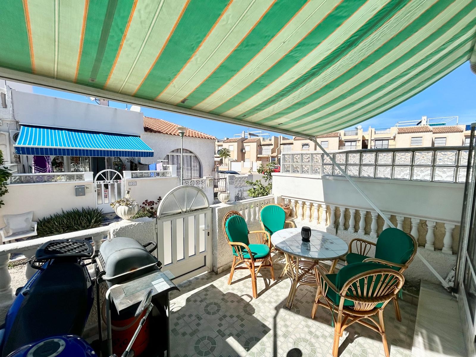 This beautifully presented 2-bedroom townhouse is located in the peaceful residential area of San Luis, close to the stunning La Mata Natural Park and just a short drive from both Torrevieja and La Mata beaches. Situated on a quiet road, the property is accessed via a pedestrian gate leading onto a sun-drenched front terrace, complete with a feature awning—perfect for al fresco dining and relaxing in the Mediterranean sunshine. This inviting outdoor space flows into a spacious glazed lounge ar...