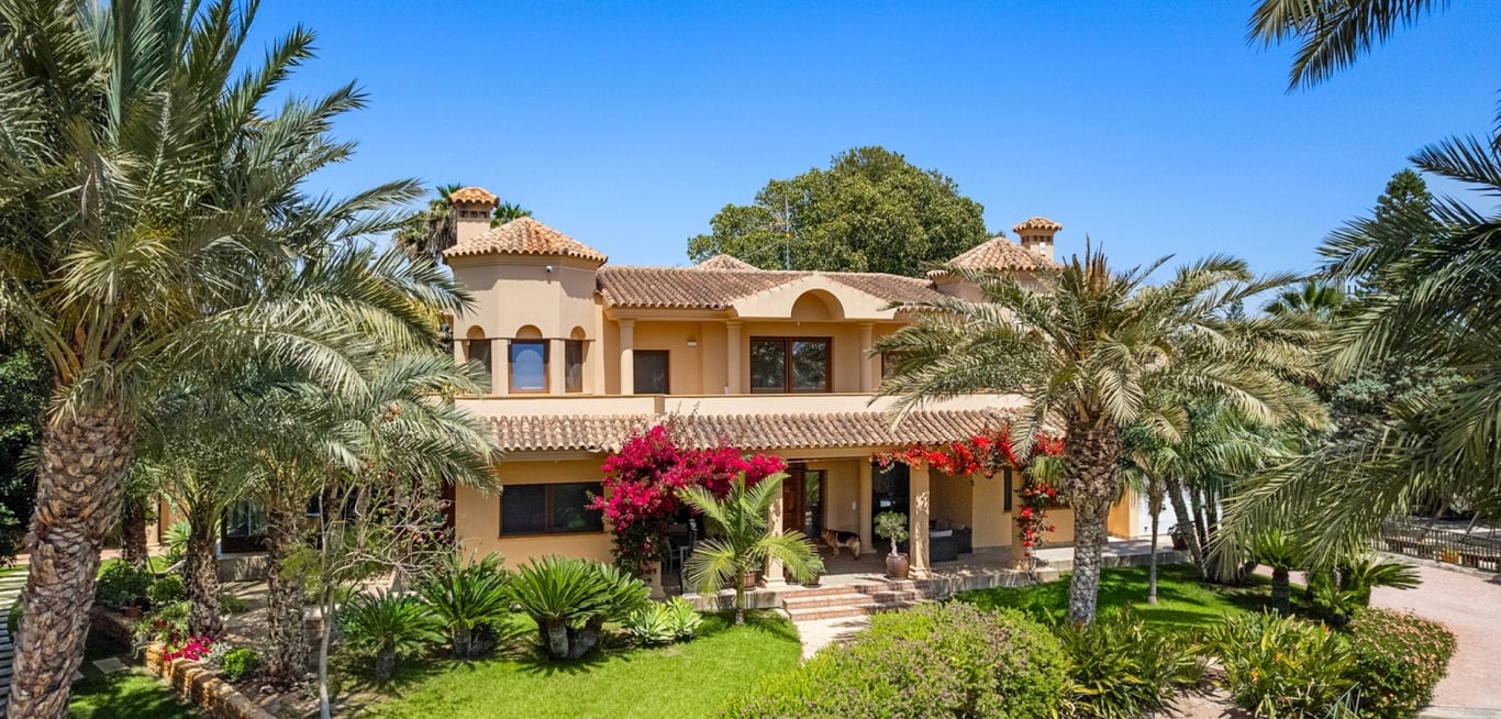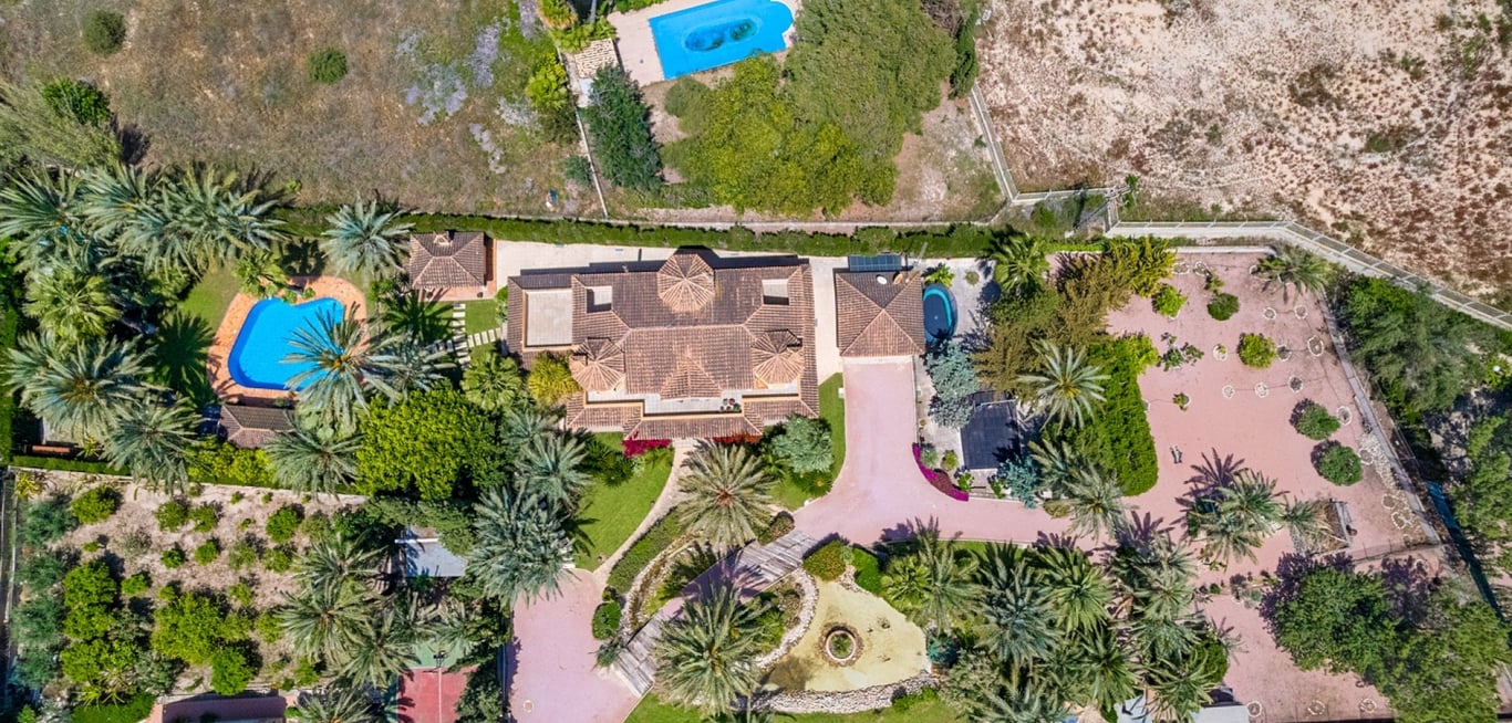 Welcome to this beautiful property located in a popular neighborhood in Elche. The finca sits on a big plot of 4.750 m2. Most of the house is completely renovated since 2019. The main house consists of two floors. On the main floor you will find a spacious foyer, a living room and dining area, a newly renovated kitchen, laundry room, a bedroom, a bathroom, and a family room/glazed terrace with wonderful views to the garden and pool. On the second floor you will find four double bedro...