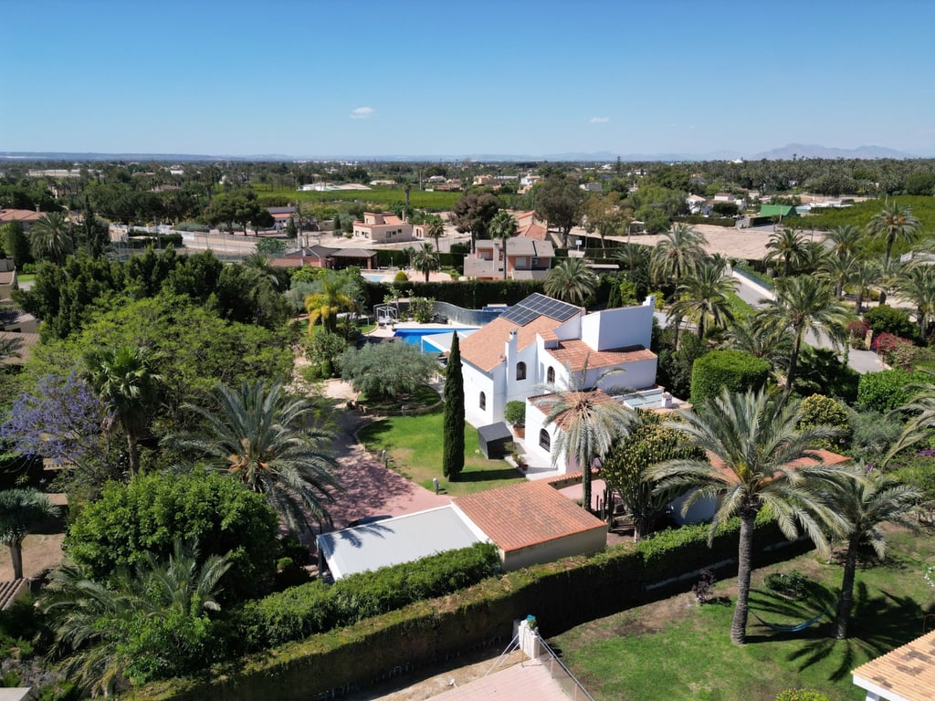 An exceptional villa is for sale located in a prestigious area of Elche, on the Costa Blanca. This impressive property, with a constructed area of 485 m2, is located on a large plot of 4,964 m2 that includes two independent buildings. The villa is surrounded by a beautiful garden and a private orchard with numerous tropical trees, a glassed-in greenhouse and a large swimming pool for the enjoyment of its residents. The main building features six bedrooms, two fully equipped kitchens, a spacious...