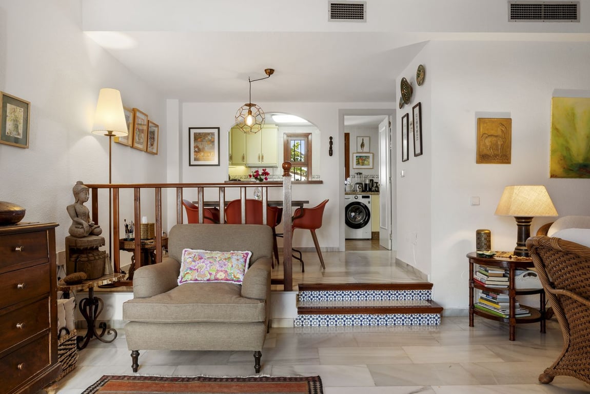 This enchanting 3-bedroom townhouse offers a charming blend of coziness and traditional Andalucian architecture, nestled within Bahia Azul, an exclusive frontline beach urbanization. The property boasts a south-to-east orientation, ensuring abundant natural light and offering serene views of the sea and the beautifully maintained gardens.The main floor of the home greets you with a welcoming entrance hallway that flows effortlessly into a bright and spacious living and dining area, complete with...