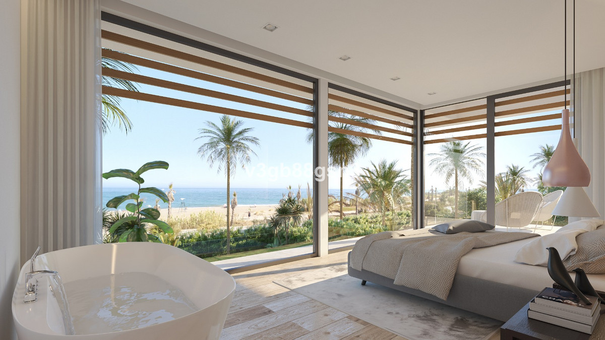 Impressive newly built contemporary villa on the beachfront of El Saladillo, in Cancelada (Estepona). Built to the highest standards of style and quality, this 4-level villa will meet all your expectations for a life of relaxing luxury facing the Mediterranean Sea. High ceilings combined with large windows to take full advantage of the light of the Costa del Sol, with a bioetanol chimney in the living room. Its 5 bedrooms are en suite, the main one having a large dressing room as well as a priv...