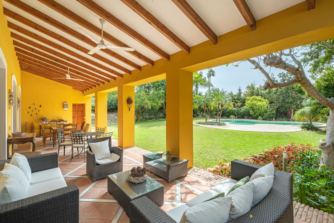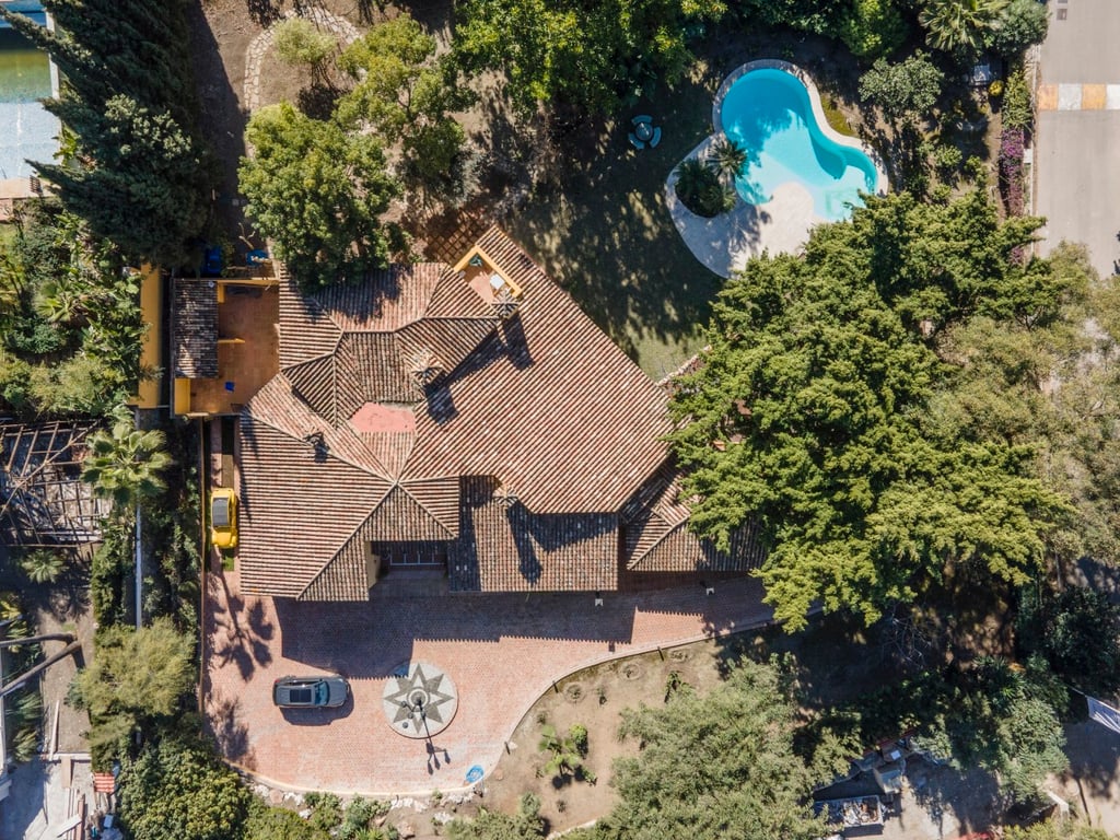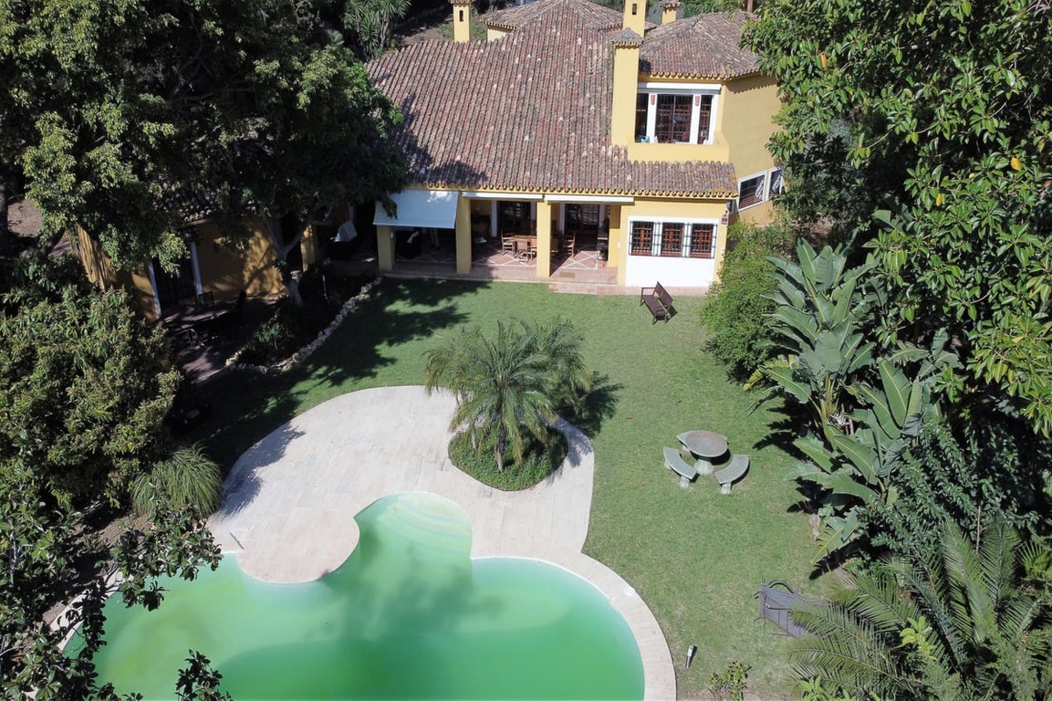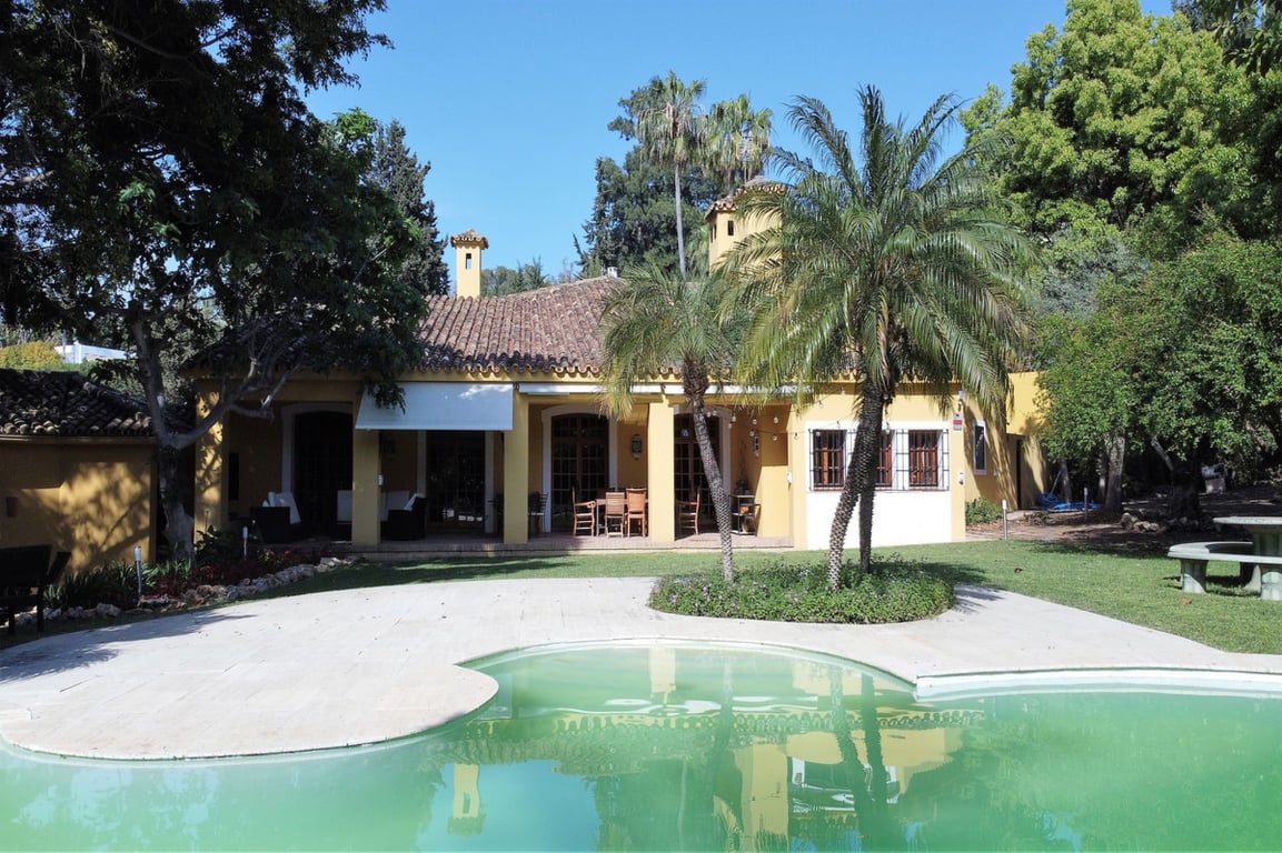 Spectacular andalusian style villa located in the exclusive area of El Paraiso Bajo in Estepona, just opposite the golf course and a short drive to amenities and the beach. Ample entrance with spaces to park at least 10 cars, access the house trough a fantastic wooden door to a distribution hall. Large high ceiling lounge with fireplace, separate dining room, TV room and office; guest toilet, kitchen with diary dining area, separate laundry zone and Staff quarter. Tiles floor and wooden beams l...