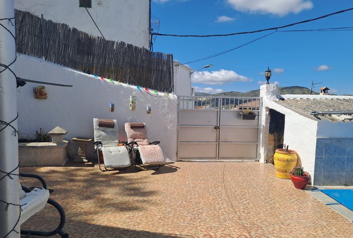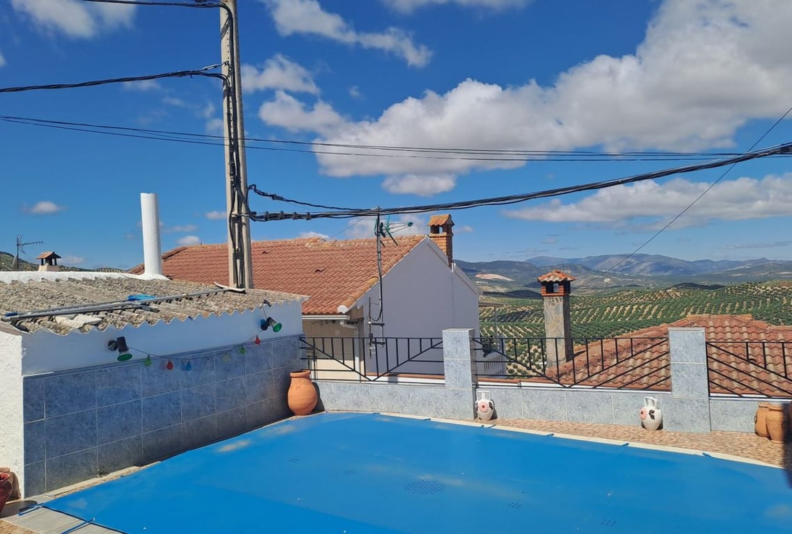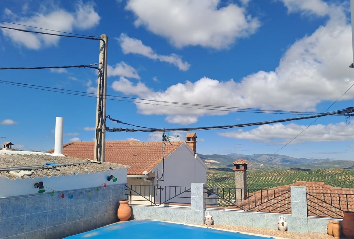 Set back from the road, the property offers stunning views across the olive groves. The spacious patio features a 4x3m pool, a garage, and a two-story outbuilding, creating an idyllic and private retreat. Entering through double gates, you'll find the pool area to the left, alongside a small outbuilding that houses a washing machine and water filtration system. The expansive, private patio extends to the left, with shaped areas and raised beds perfect for planting. The large two-story outbuildin...