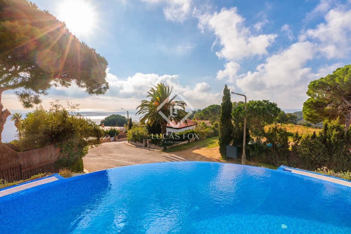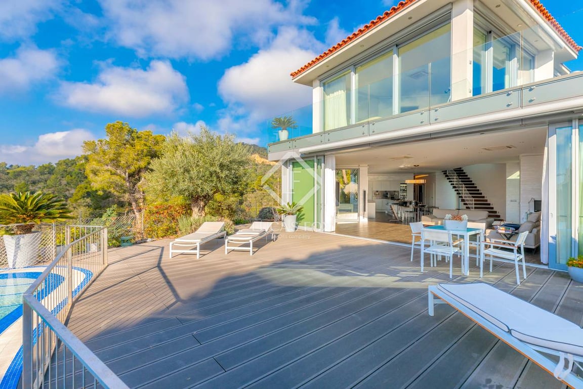 We enter the property via an automatic door that gives access to the outdoor parking area and the garage. Once inside the villa, having accessed the main floor, we find a fantastic fully equipped open kitchen with Gaggenau appliances. Next, we will find a bright living room with fantastic sea views and access to the terrace and pool area, as well as a guest toilet. In the interior area, it offers two bedrooms, a bathroom with a shower, the machine room and a laundry room. On the upper floor,...