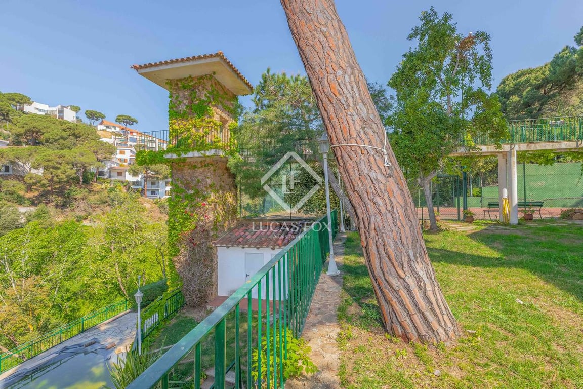 Stately villa for sale in Cala Canyelles, Lloret de Mar. It is located just 900 metres from the beach and the town's port. The house, which is very bright and has high ceilings, is elevated above street level thanks to stone walls. Thus, it enjoys beautiful views both from the garden and from the inside. The main house is spread over two floors and consists of five bedrooms and three bathrooms. The property also offers a garage for several cars at street level, which is equipped with a for...