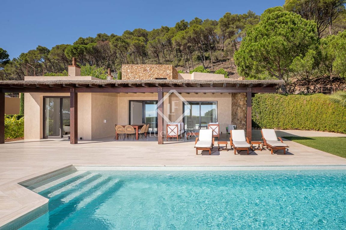 Lucas Fox presents this magnificent villa located in the coveted Aiguablava, the most beautiful cove in Begur. The house is located in a private complex with few homes, where, in addition to its unmatched aesthetics, the owners enjoy a small and well-kept community, with access restricted exclusively to the owners. To the rear, the complex borders an extensive protected forest, designated as a green area, ensuring its preservation in the future. The house has a large living-dining room, a kitc...