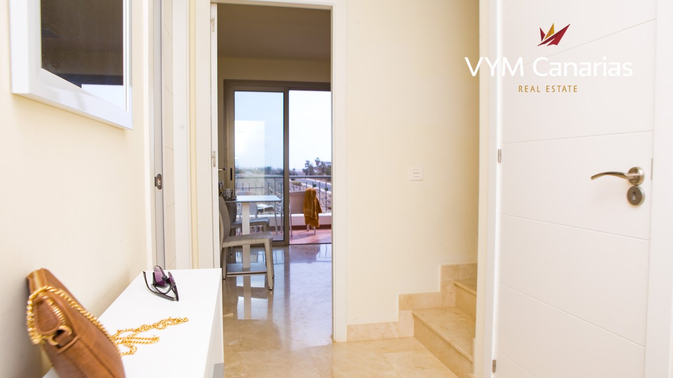 Hermoso duplex en venta en el sur de Tenerife La Caleta en el complejo de lujo «Magnolia Golf Resort» - 2 dormitorios, 2 baños, amplio salón con acceso a una terraza grande y soleada (33m2) con vistas a la piscina y al océano, cocina abierta de diseño moderno con comedor, y también con acceso a la terraza. Uno de los dormitorios también tiene acceso a la terraza (11m2) Los dormitorios y los baños se encuentran en la planta superior. El piso se vende con muebles de buena calidad y con garaje y tr...