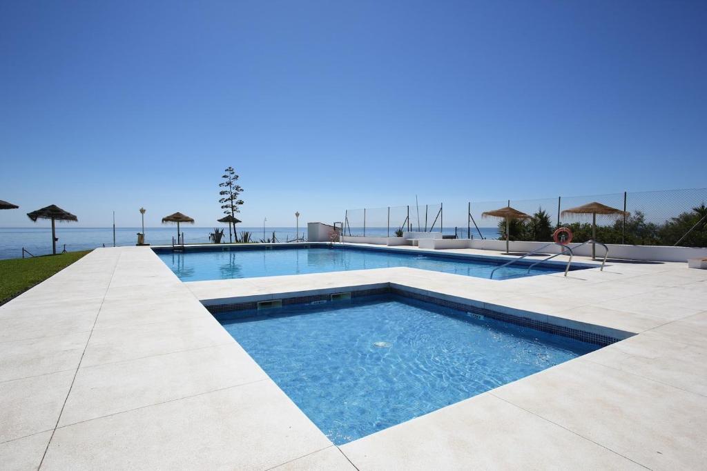 Located in an exclusive and peaceful beachfront development, this charming corner townhouse offers a privileged setting right by the sea. The community is pleasant and well-maintained, featuring beautiful landscaped gardens and a large communal swimming pool facing the sea, perfect for enjoying the Costa del Sol’s wonderful climate. Direct access to the seaside promenade allows easy connection to the nearby beach bars and the picturesque marina of La Duquesa, where you will find excellent resta...