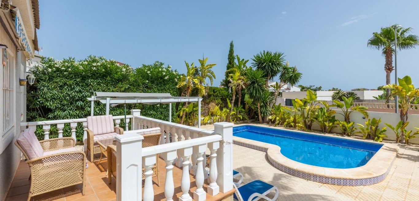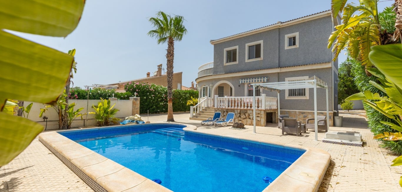 We present a detached villa set on a private plot of 885 m2, located in the La Marina area of San Fulgencio. The property offers 5 bedrooms and 5 bathrooms, including one outdoor bathroom that can function as a pool bathroom or be used by guests. The functional layout makes the house suitable both as a comfortable residence for a larger family and as a holiday home for regular stays in Spain. The interior includes a spacious and bright living room with a fireplace, a dining area, a fully equi...