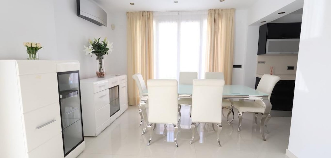 Cabo Roig Detached villa on a 415 m2 corner plot overlooking two streets.. This modern, two-story home offers a contemporary and functional design, measuring 222 m2. It features 4 spacious bedrooms and 3 bathrooms, a bright living-dining room with a semi-integrated kitchen, a private pool, a driveway, and a large private solarium, perfect for enjoying the sun year-round.. Sold fully furnished and equipped with air conditioning. Located in one of the most exclusive areas of the coast.
