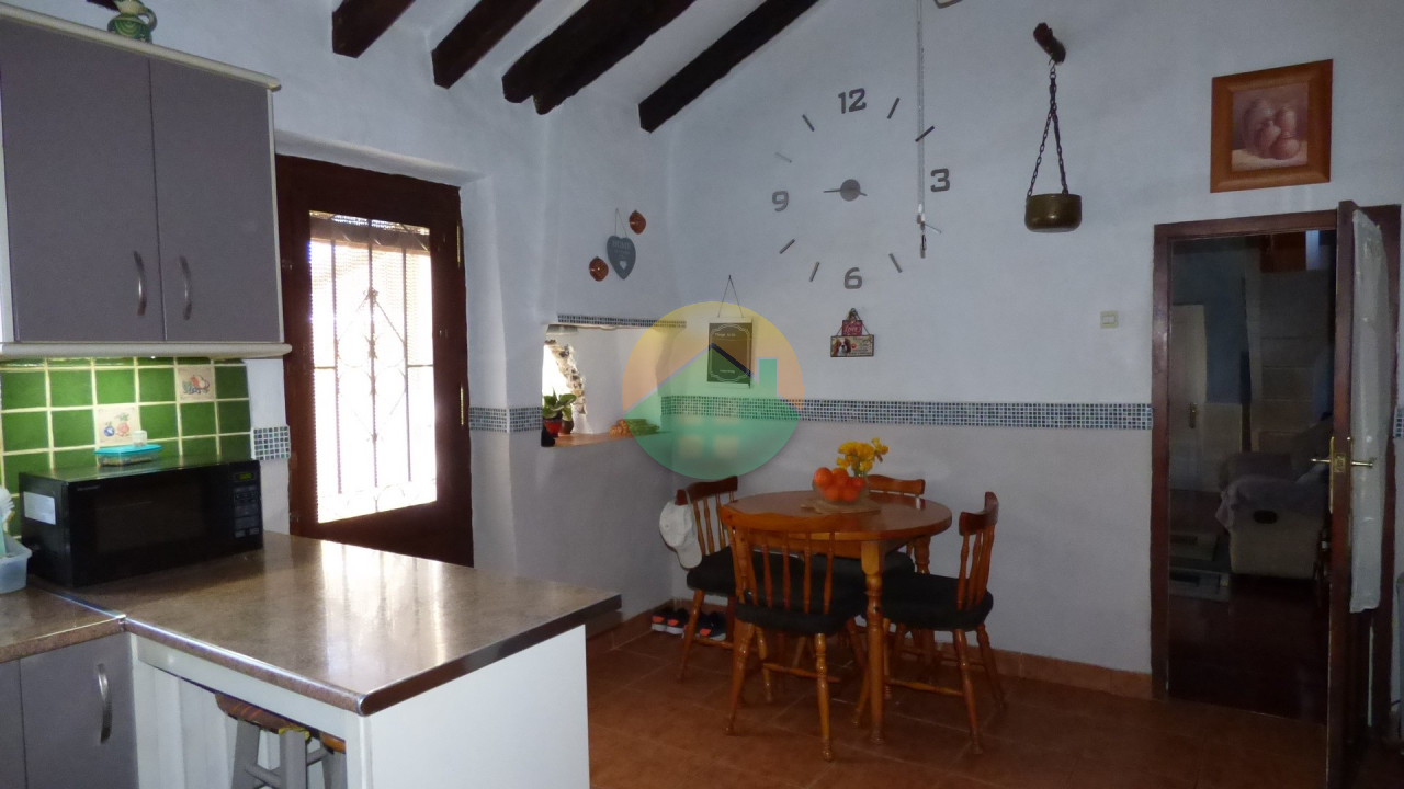 This is a beautiful traditional Spanish country property with high beamed ceilings for sale in Las Palas, Fuente Alamo.. This semi-detached property offers 3 bedrooms, 2 bathrooms and sits on a large 2500m2 plot. The entrance is via a gate to a beautiful mature garden with plenty of trees, fruit trees and shrubs. There is a gravelled path that leads to the side of the property where there is a large workshop / garage . To the rear of the property, there is a terrace area including an outdoor ...