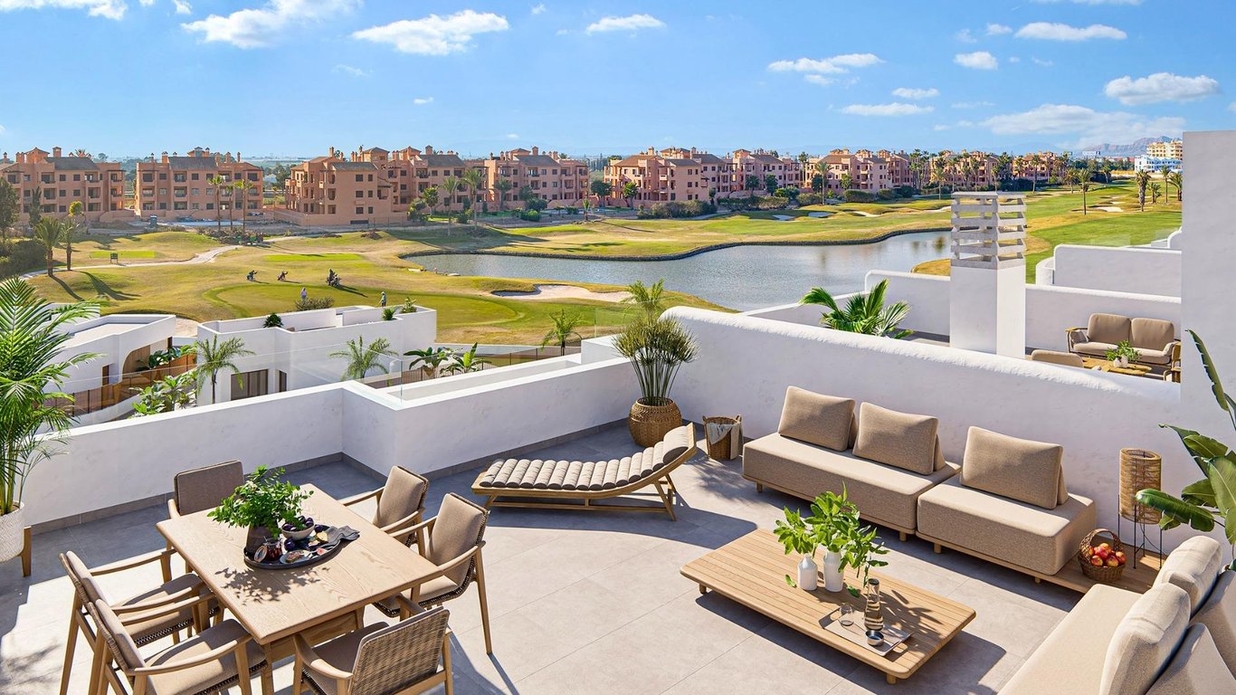 Lovely apartment with fantastic views, on one side the golf course and the pool and the other side the Mar Menor. Well layout apartment terraces and a massive (67 m2) solarium. Private parking space and storage room in the basement. ~~It consist of nice lounge with open kitchen. The lounge got a south facing terrace over looking the pool and the golf course. One the other side is also a small terrace with staircase to the massive private solarium on the roof. ~~Kitchen got a lovely breakfast bar...