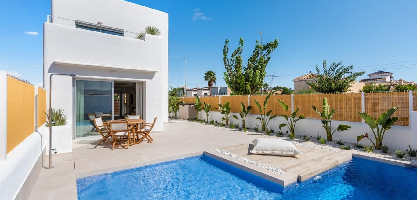 IBICENCAN STYLE NEW BUILD VILLAS IN LOS ALCAZARES Ibiza style villas build over 2 floors, has 3 bedrooms, 2 bathrooms, living room, kitchen, terrace, parking area and private pool. An options for a private solarium at an extra cost. Carefully designed housing with high quality materials to satisfy the most demanding clients. Villas located 1 km from the beach and the town of Los Alcázares, where you can practice various water sports, surrounded by several golf courses. City of Cartagena l...