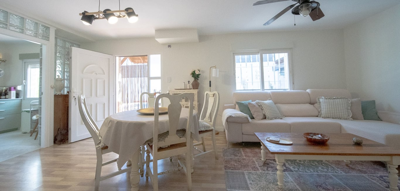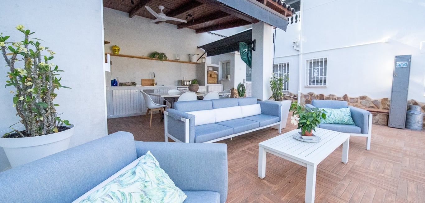 Semi-detached Villa with 4 Bedrooms in Los Balcones, Torrevieja. Semi-detached property located in one of Torrevieja’s most exclusive neighbourhoods: Los Balcones. The home offers 130 m2 built over two floors. The ground floor includes a living-dining room, an independent kitchen, one bedroom and one bathroom. Upstairs, you'll find three bedrooms, one bathroom and a glazed terrace. It also features a 161 m2 garden with a covered summer kitchen, a guest toilet, chill-out area and privat...