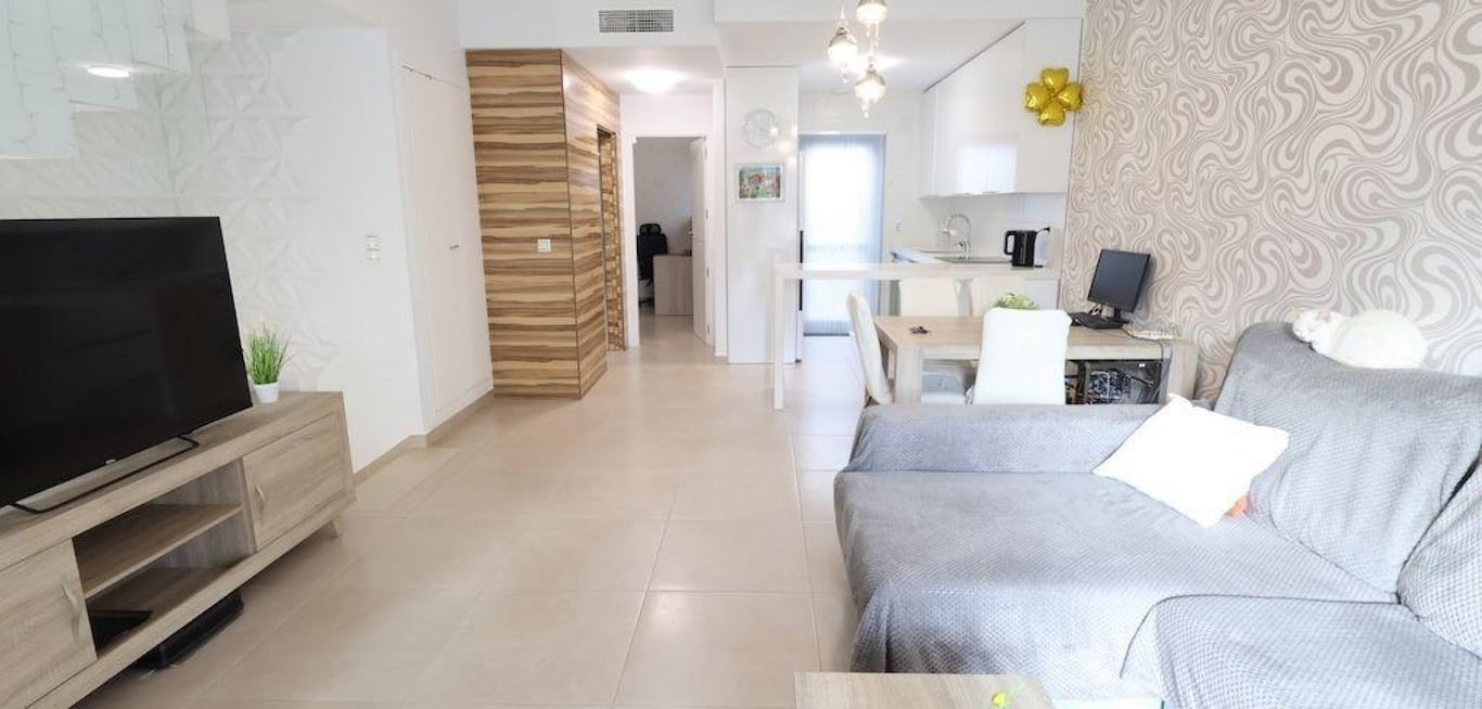 Playa Flamenca, Residencial El Manantial semi-detached house with south facing two floors plus basement intended for garage of 101 m2 and 97 m2 of garage, the house has 3 bedrooms (1 of them on the ground floor) and 3 bathrooms, living room, kitchen open to the living room with back patio, large front garden in front of the communal area and a large solarium with views of the communal areas and the 2 communal swimming pools and children's play area.
