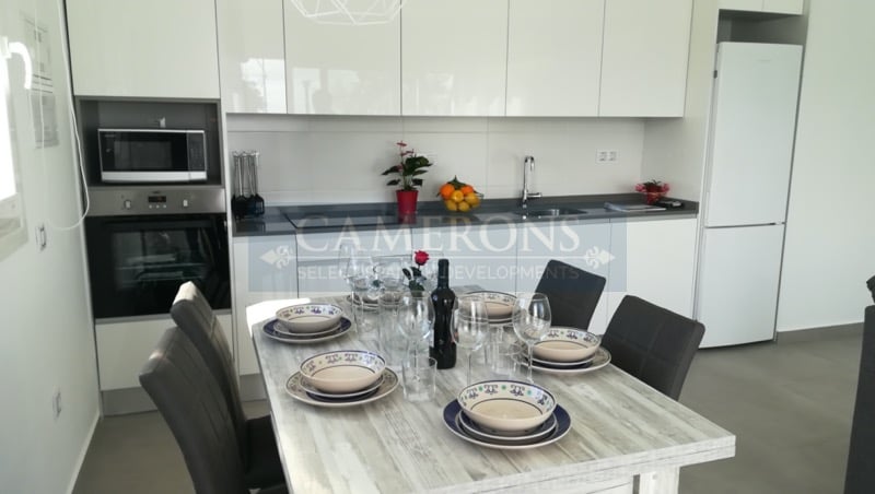 New promotion of independent villas and semi-detached houses, with 2 different models, one all in one storey with a big solarium on top, and duplex type. All boasting 3 bedrooms with two bathrooms, one of them being en suite, with fitted wardrobes; modern kitchen furnished in matt white with high standard finishes; large living room with terrace and direct access to the garden and private pool. From the outside, you can access the 77.59 square meter solarium via a staircase. The garden is finish...