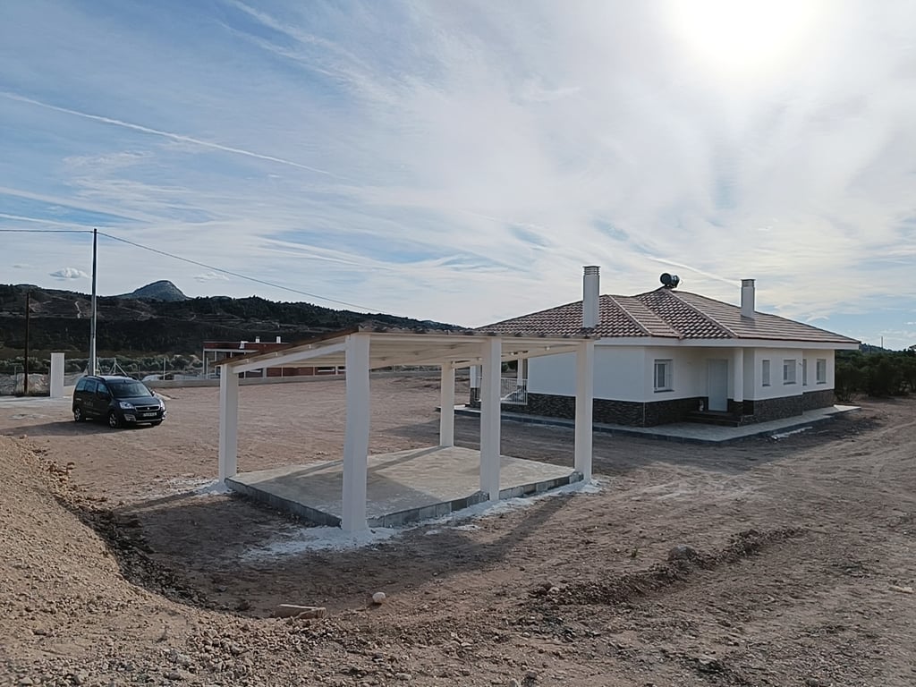 We are delighted to present this fabulous brand new built villa in Macisvenda near Hondón de los Frailes Traditional in style on the outside and with a modern touch on the inside. It has 3 bedrooms with fitted wardrobes, 2 bathrooms (1 ensuite), open modern kitchen, large living room, porch with incredible mountain views. This price includes an open covered garage similar to the aesthetics of the house. It has pre-installation for air conditioning (hot / cold). You can build a pool, barbec...
