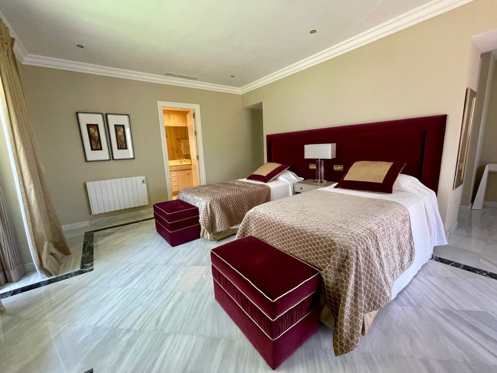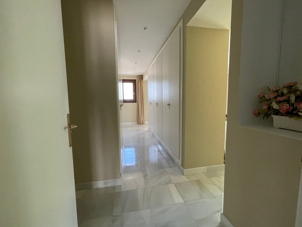 This unique penthouse is located in the Golden Mile, in a gated community with pools and nice gardens. This spacious apartment consists of 3 bedrooms, 5 bathrooms, all on one level. It is newly refurbished, has air conditioning and central heating, a fully equipped kitchen, and a separate utility room. There is a large living-dining room and a bar area. A well-maintained house for family or entertaining. unity with pools and nice gardens. A well-maintained house for family or entertaining.