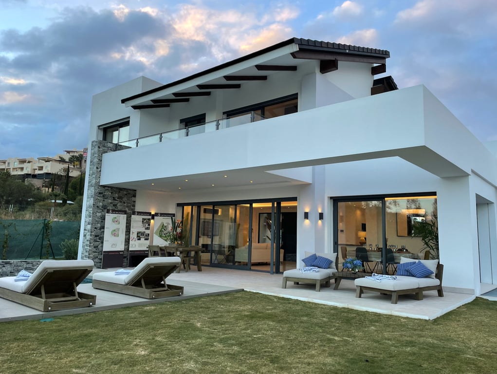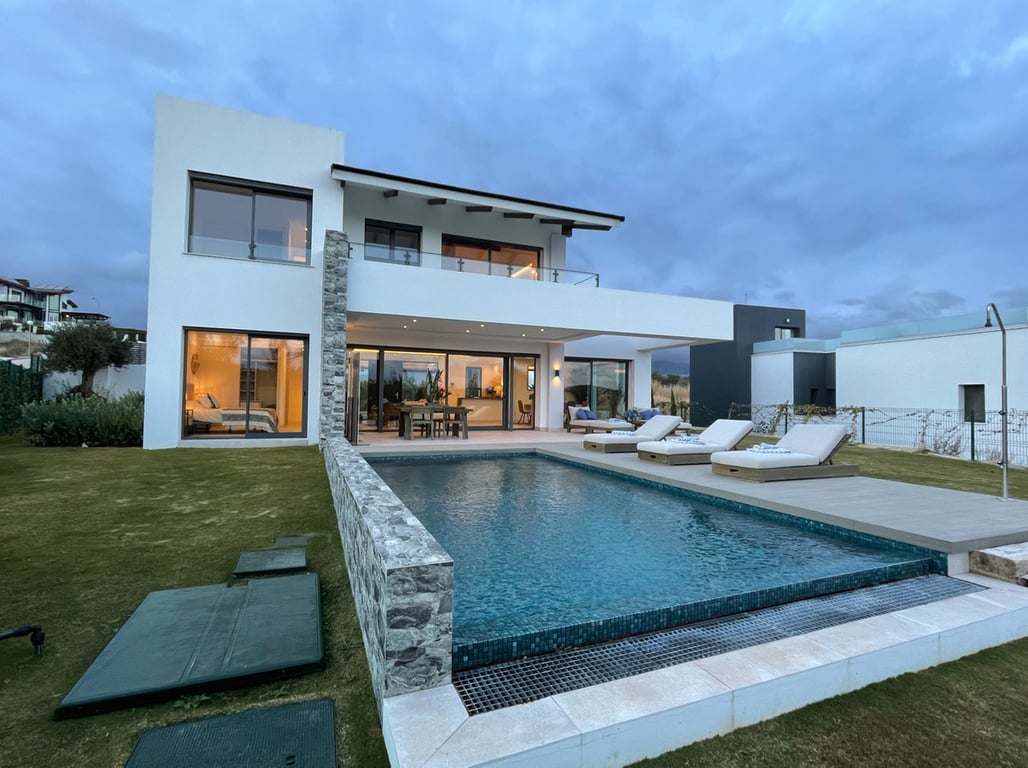Newly built modern Frontline Golf Villa located in Cerros de Aguila, Mijas Costa. Within a short drive to amenities and beach. This brand new villa offers 4 bedrooms, 4 bathrooms and a guest toilet. The master bedroom has its en-suite bathroom, a dressing room and a private terrace with wonderful views. Living room with ethanol fireplace and dining area open to a modern fully equipped kitchen. From the living room you access a covered porch with an infinity pool and private garden. On the gro...
