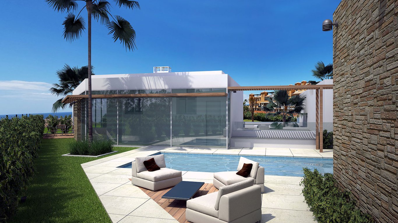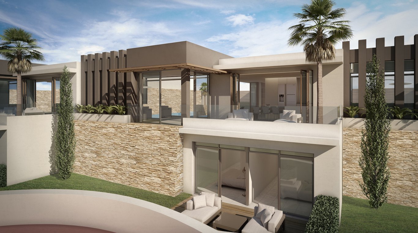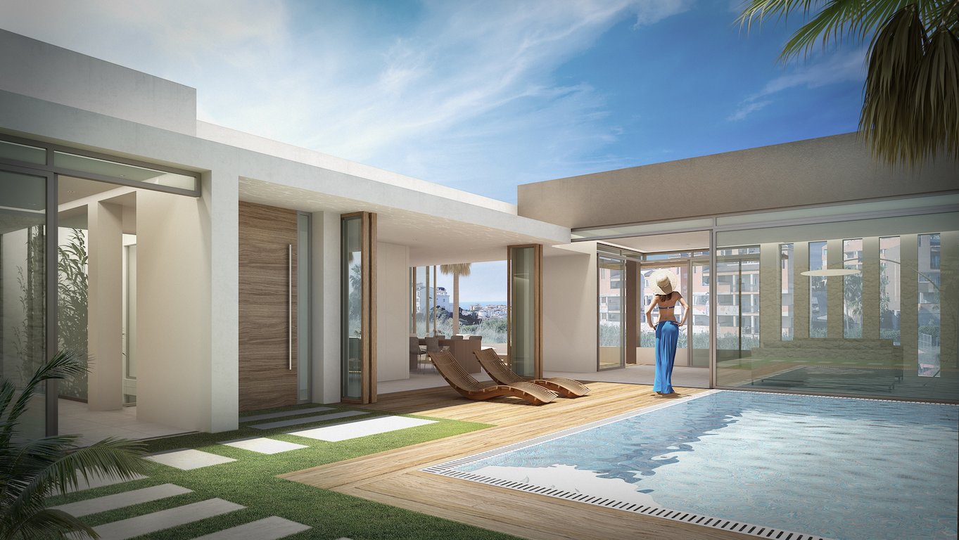 Total built size from 200m2 Master suite with ensuite bathroom and large wardrobe Two further double bedrooms with ensuite bathroom and ample wardrobe space High quality fitted kitchen, bathrooms and wardrobes 7x3.5 metre swimming pool Large integrated indoor-outdoor terraced spaces with beautifully designed intergated garden features Separate guest section Large extra living room, gaming area with tropical atrium garden All floors inside and out with high quality porcelain tiles in comb...