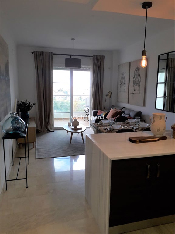 Mediterranean village in Manilva, 5 minutes from Sotogrande and 1km from the beach. Spacious and bright 2 bedroom apartment with terraced architecture allowing a wide view of the coast and orientation facing the sun. It consists of 2 bedrooms, 2 bathrooms (one ensuite), open-plan kitchen, terrace, balcony, with excellent qualities and outdoor parking space. Magnificent urbanization with all qualities and services with communal areas with gardens, swimming pools, barbecue area, playground, etc....